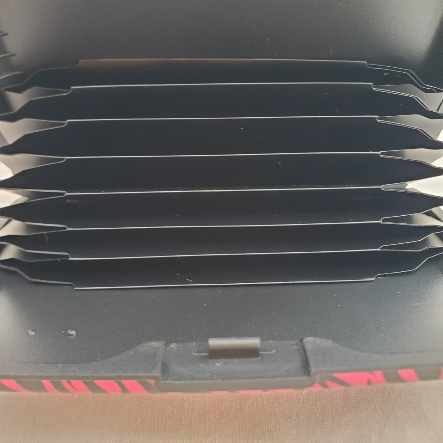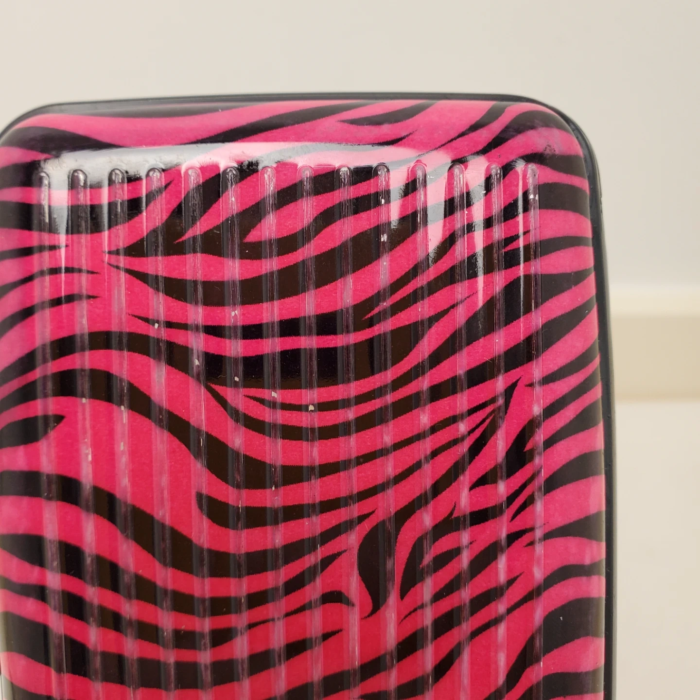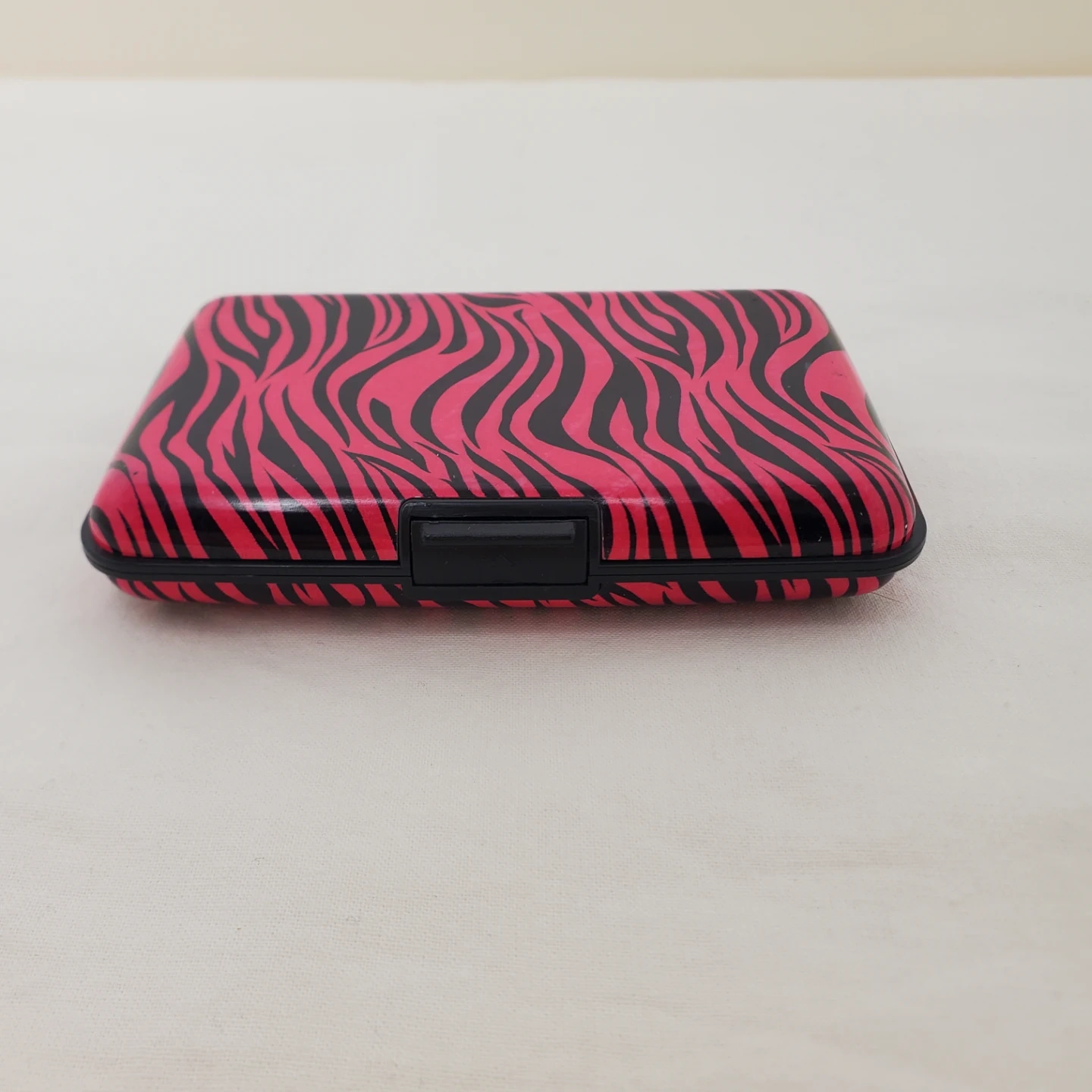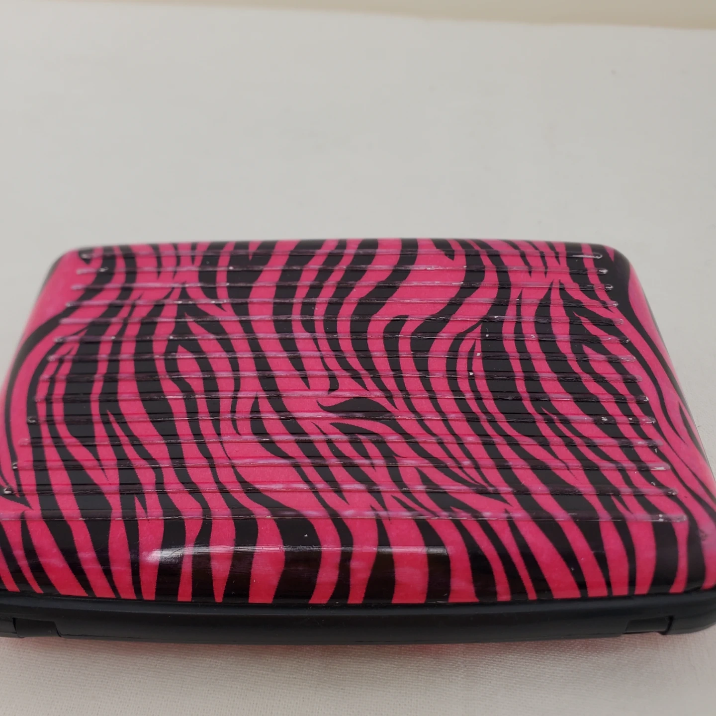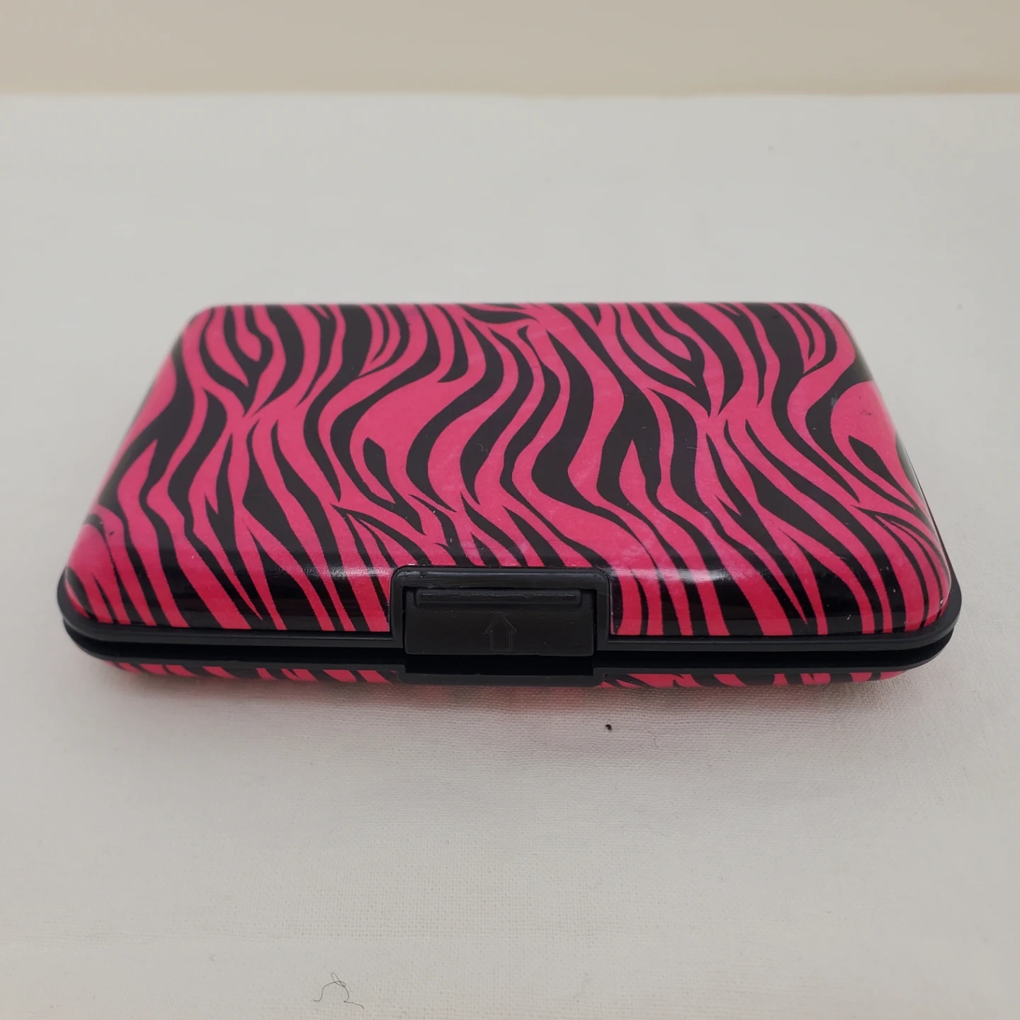 A compact card holder featuring a bold pink and black zebra print. It opens to reveal multiple slots for organizing your cards. Has some wear but it is in over all good shape. Located northside.