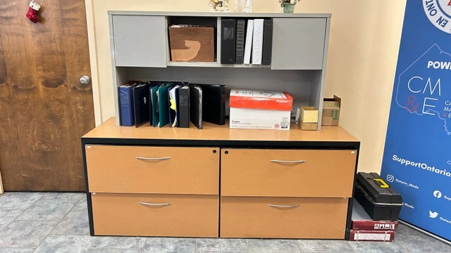 This used office cabinet, featuring two spacious drawers and an upper shelving unit, is perfect for organizing your workspace. While it shows signs of use, it remains fully functional and ready to store your files and office supplies efficiently. It has two large drawers for ample storage and an upper shelving unit for books or decor. This cabinet is looking for a new home! If you see this ad, the cabinet is still available, ready to bring order to your office or workspace. Cash accepted.