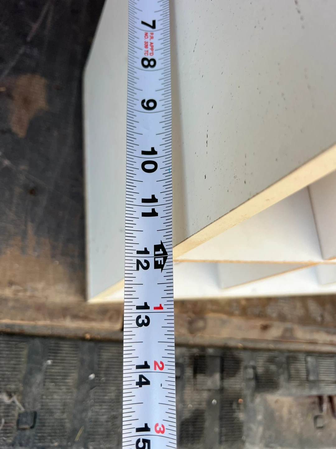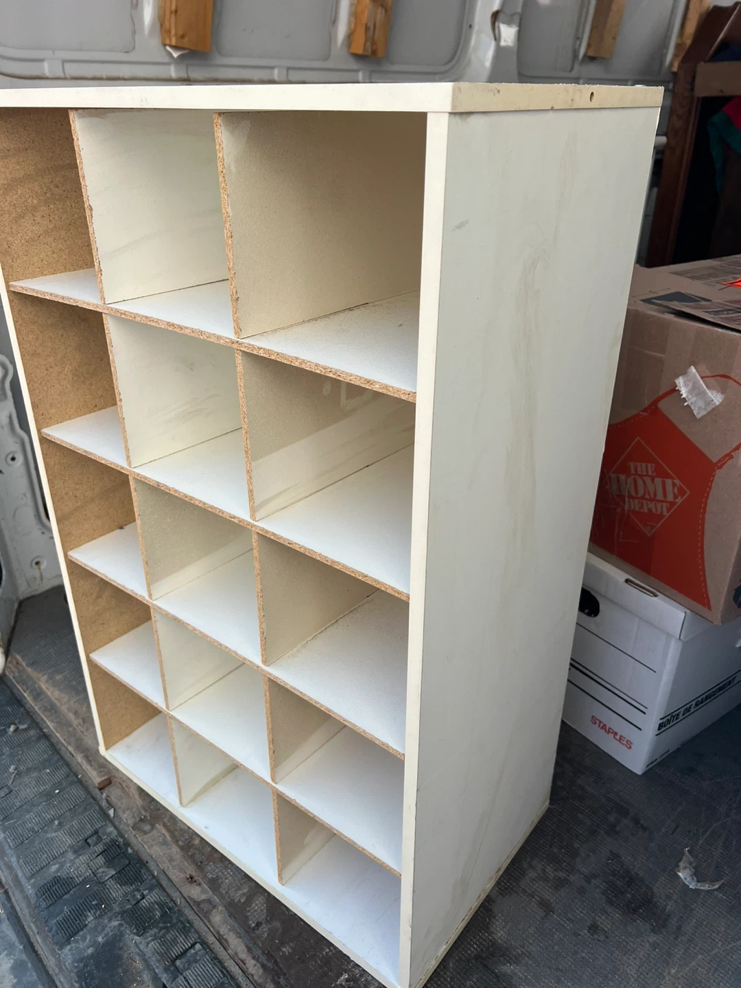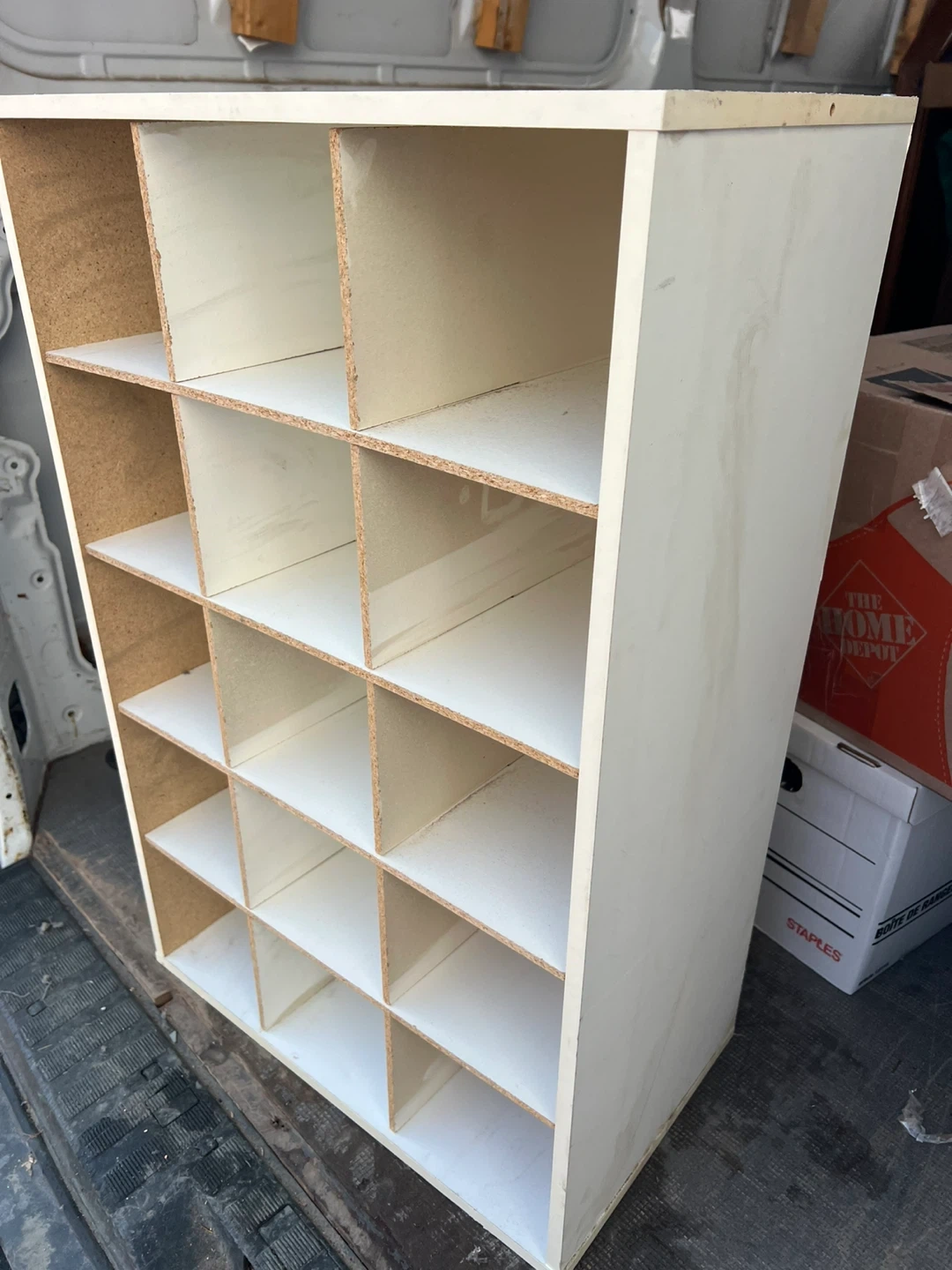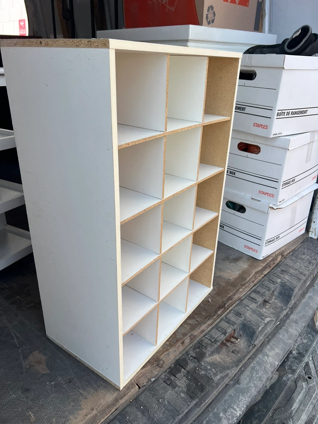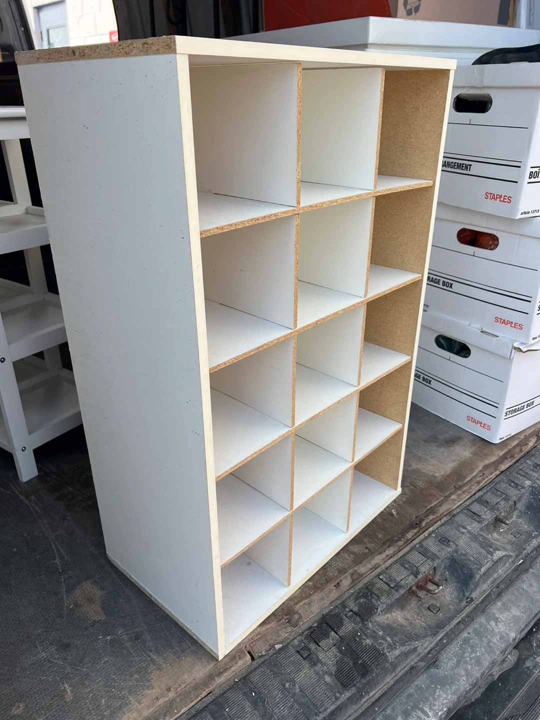 Used White cube organizer shelf with 12 compartments. Made of particle board with a laminate finish. Great for shoes, books, or crafts!