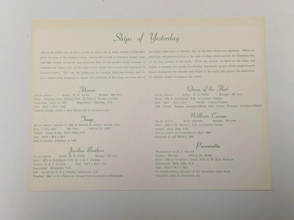 This collection features art prints of historic Canadian ships, including 'Tikoma', 'Jardine Brothers', 'Queen of the Fleet', 'Troop', and 'William Carson'. The prints depict famous vessels from Canada's maritime history. These are reproductions of original paintings.