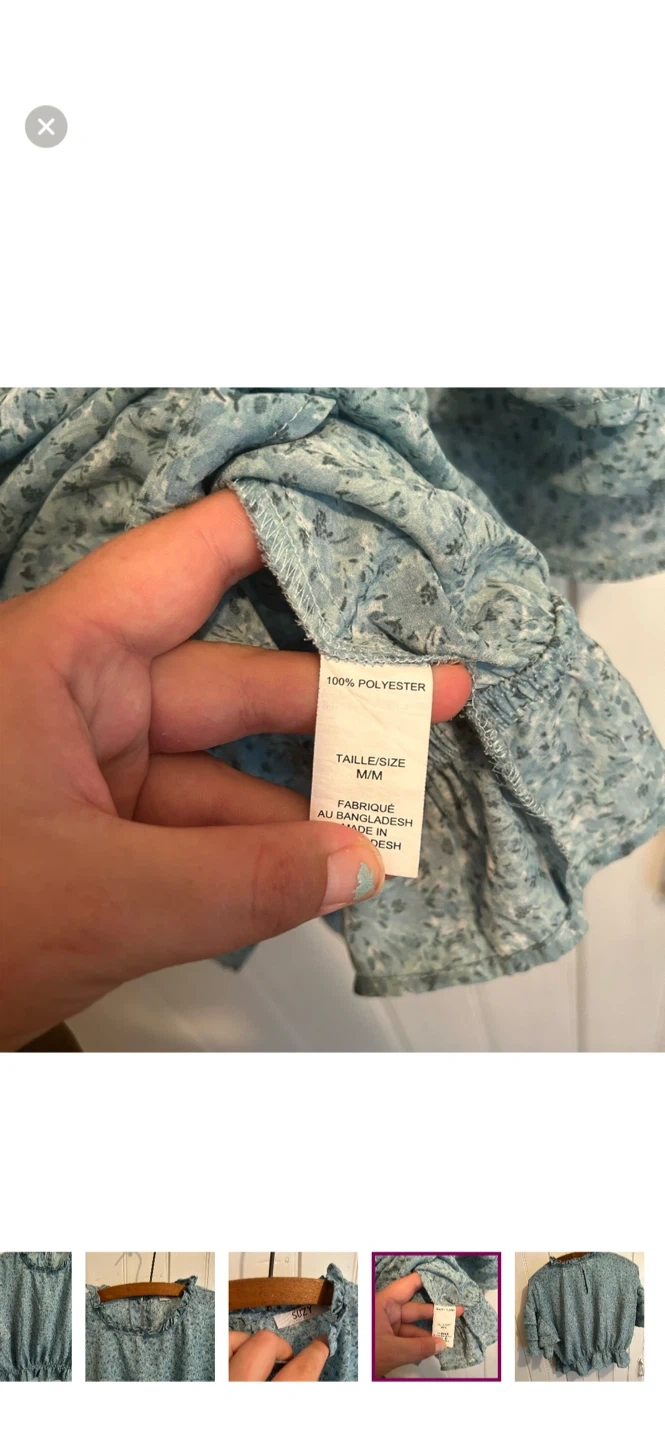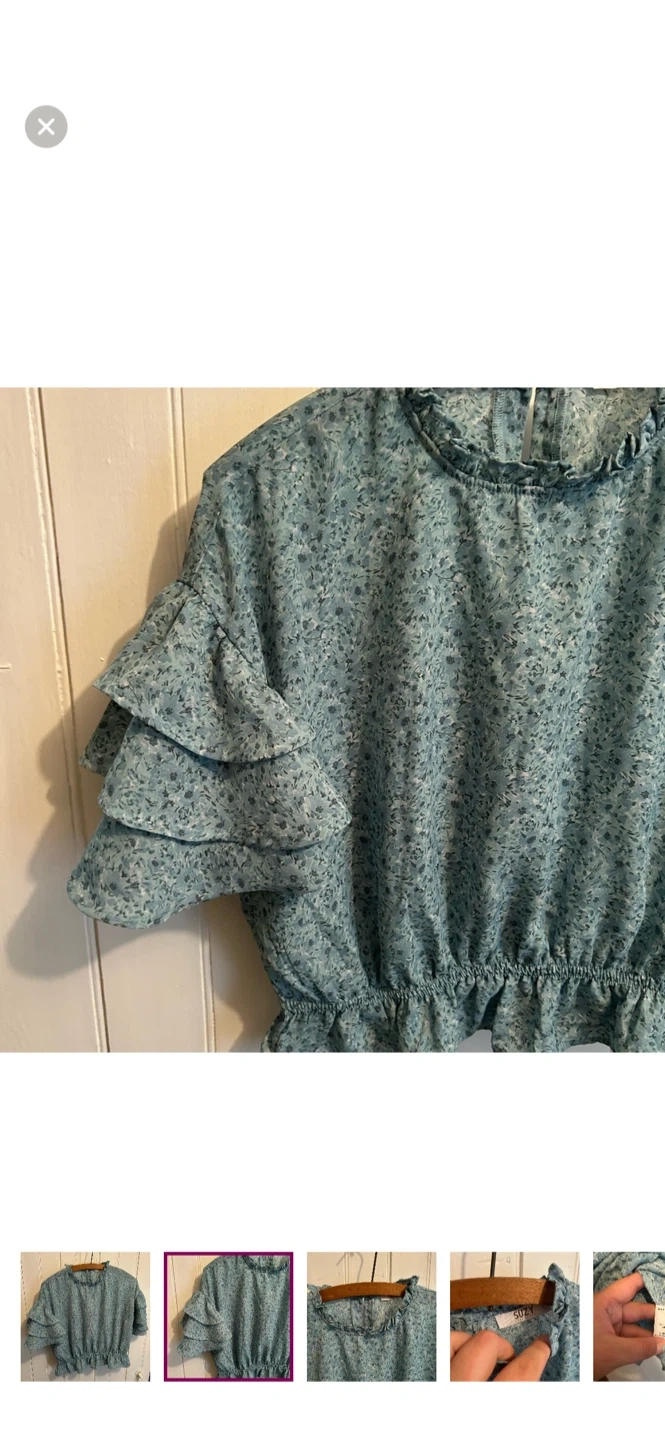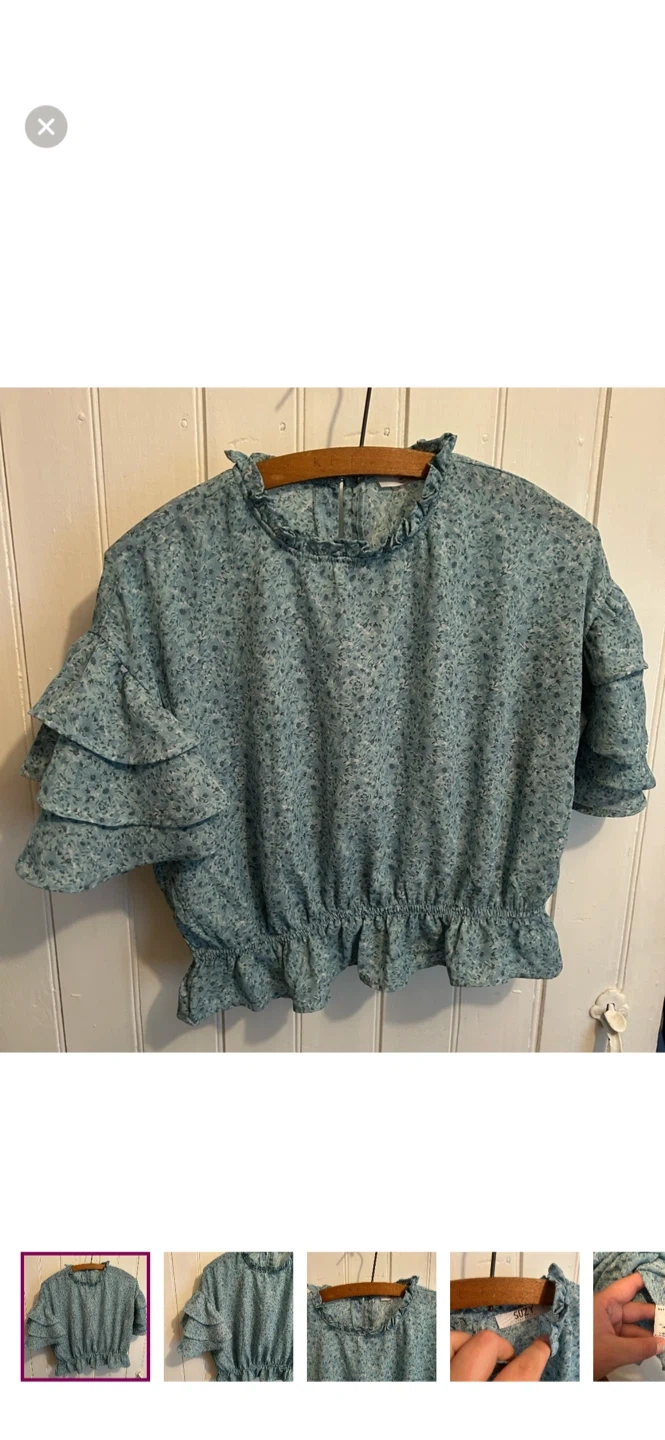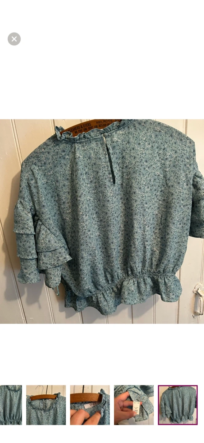Suzy sheir brand. Short ruffle sleeve high neck blouse. Slightly cropped. Blue floral. Size medium. Brand new condition