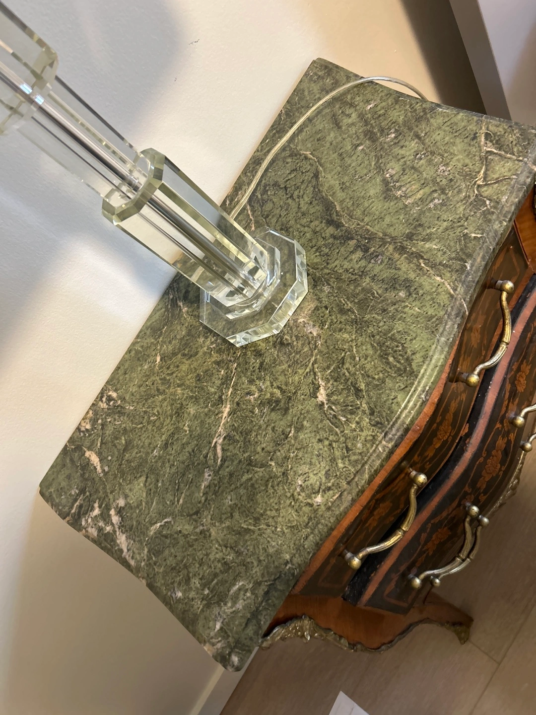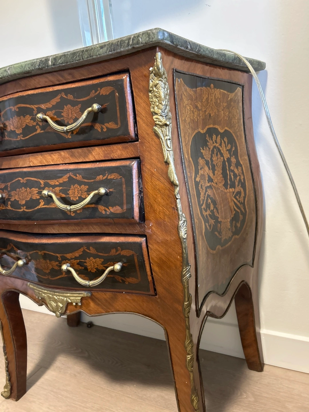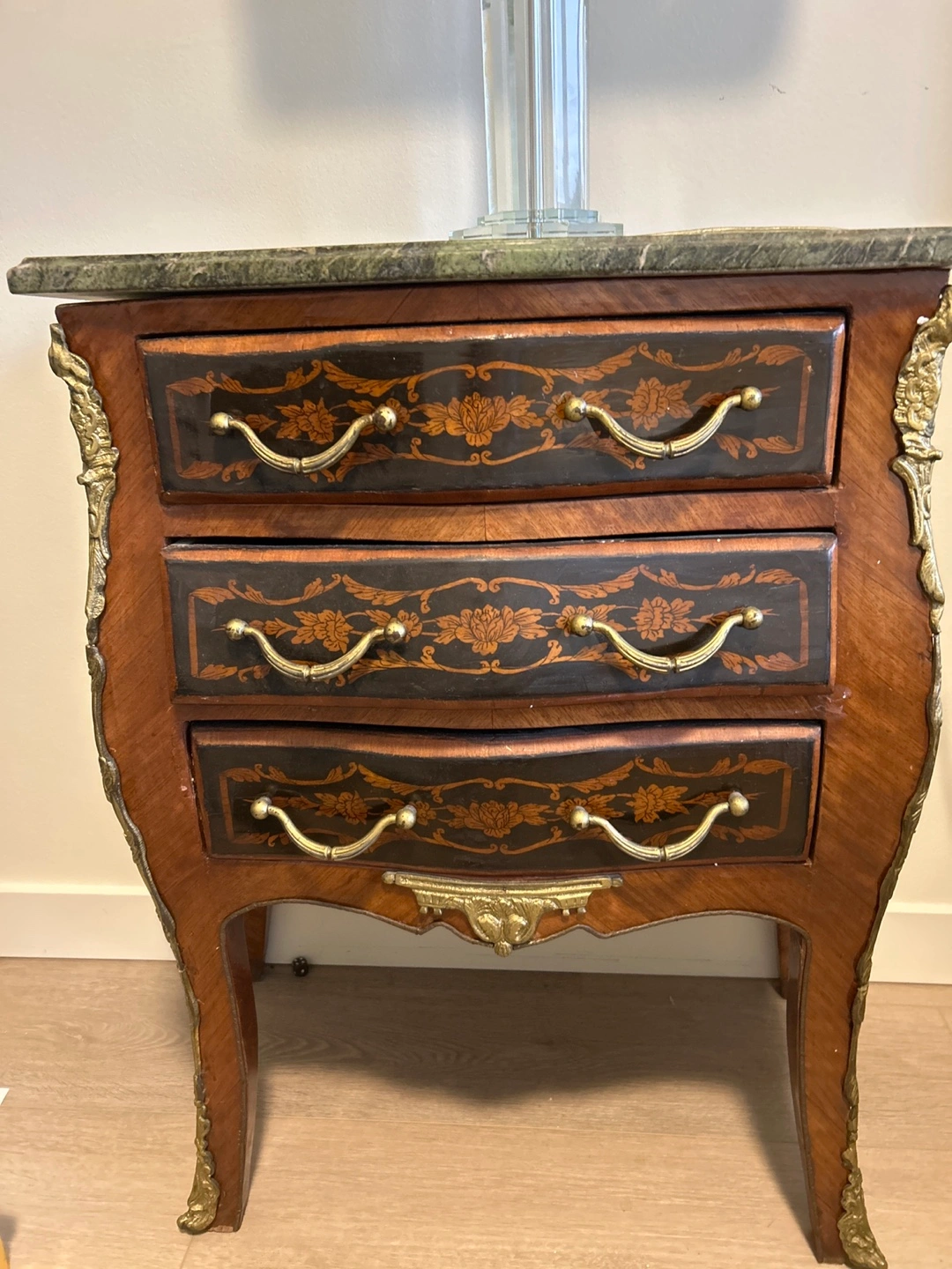 A beautiful antique chest of drawers featuring intricate marquetry inlay and ornate brass hardware. It has three drawers for storage and is topped with a green marble slab. This piece would make a striking accent in any room! 350$ obo