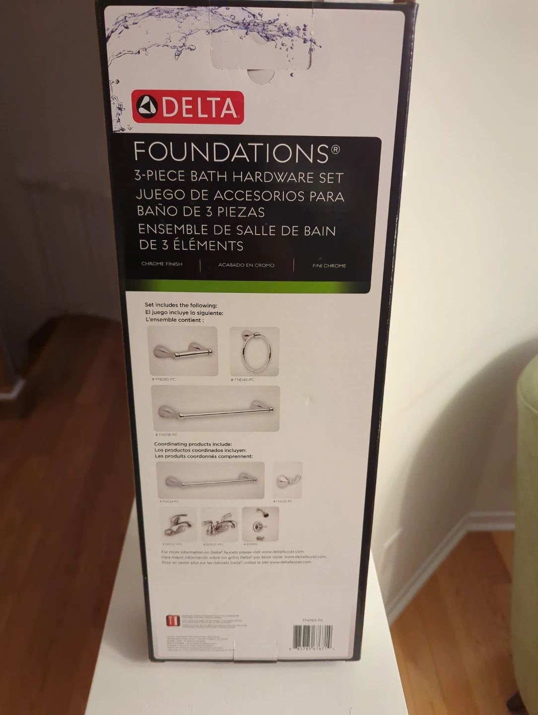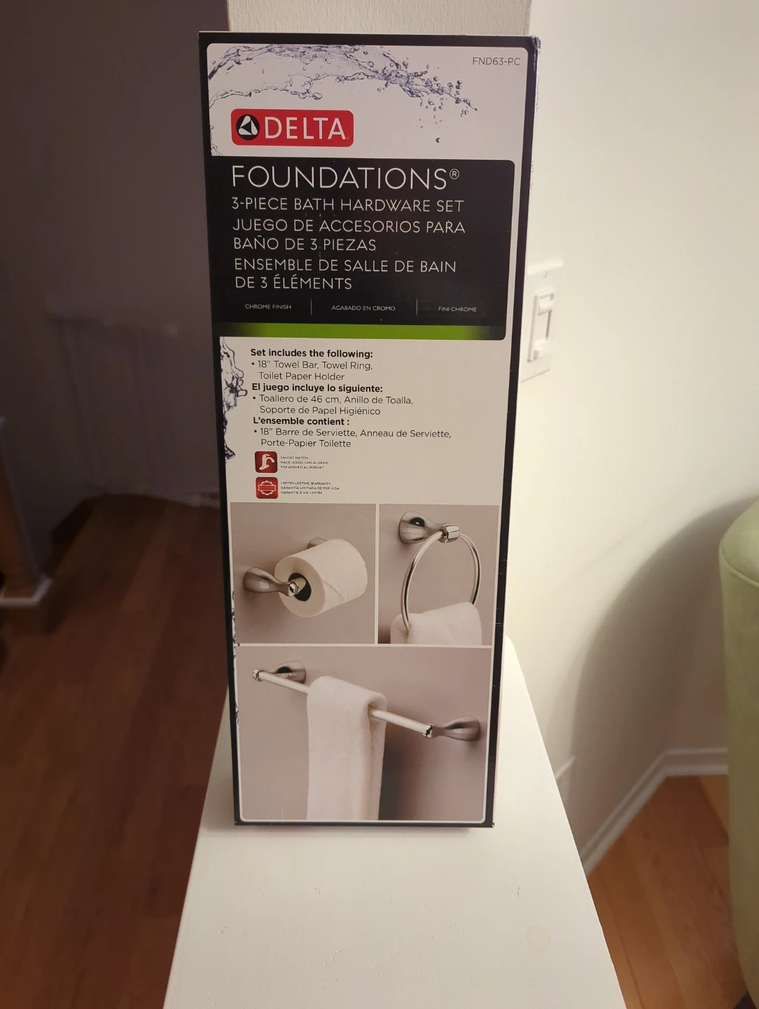 This Delta Foundations 3-piece bath hardware set includes an 18" towel bar, towel ring, and toilet paper holder. It features a chrome finish. The set includes all necessary mounting hardware for installation.