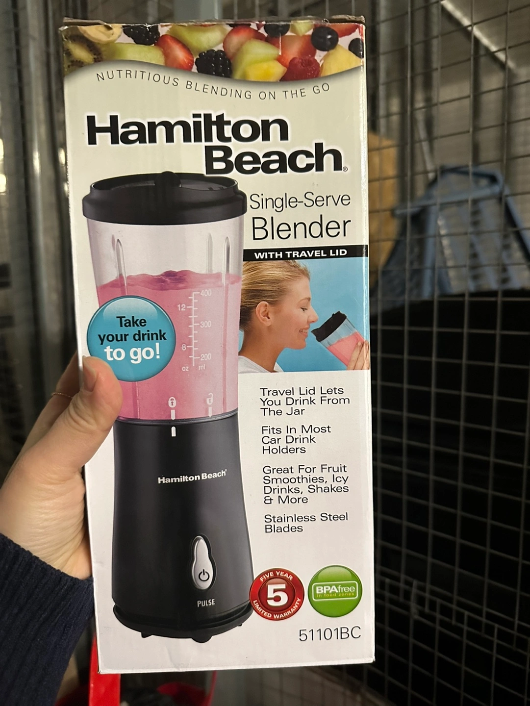 Black single-serve blender with travel lid. Includes a pulse function. Great for smoothies, icy drinks and more. Five-year limited warranty.