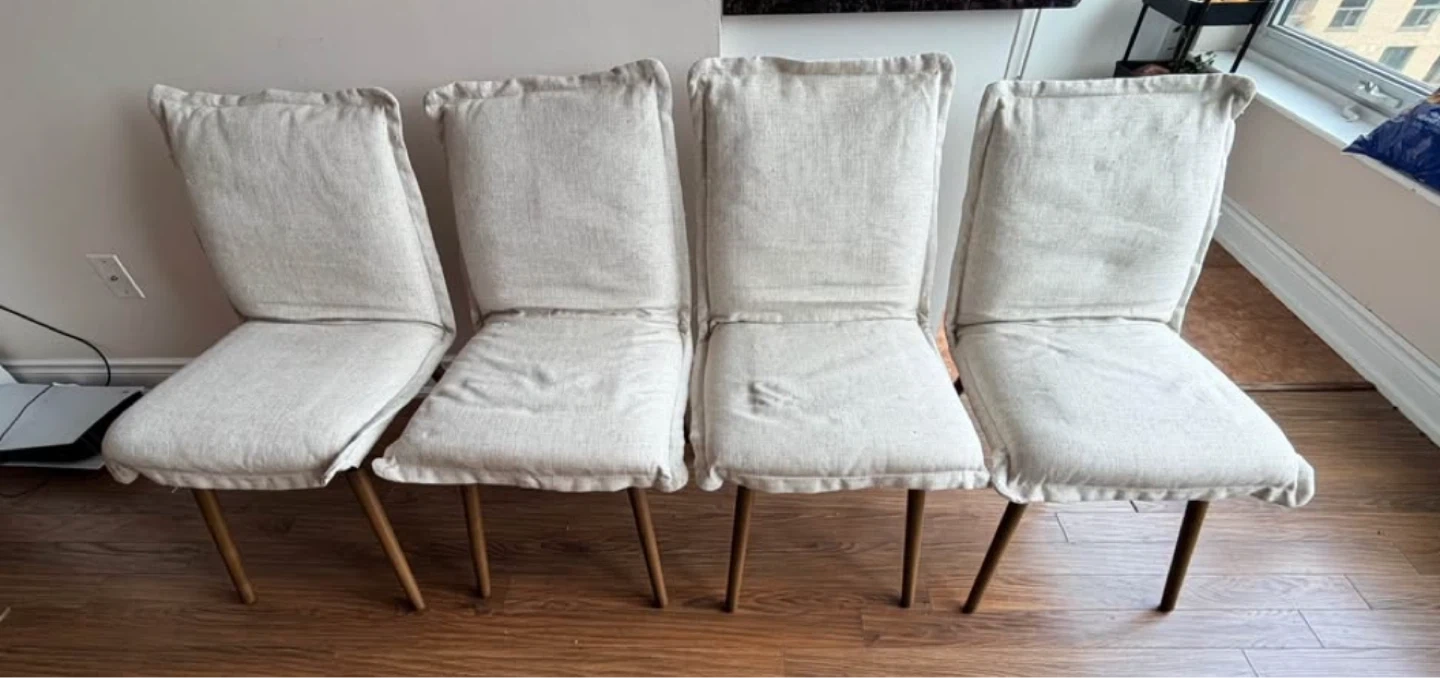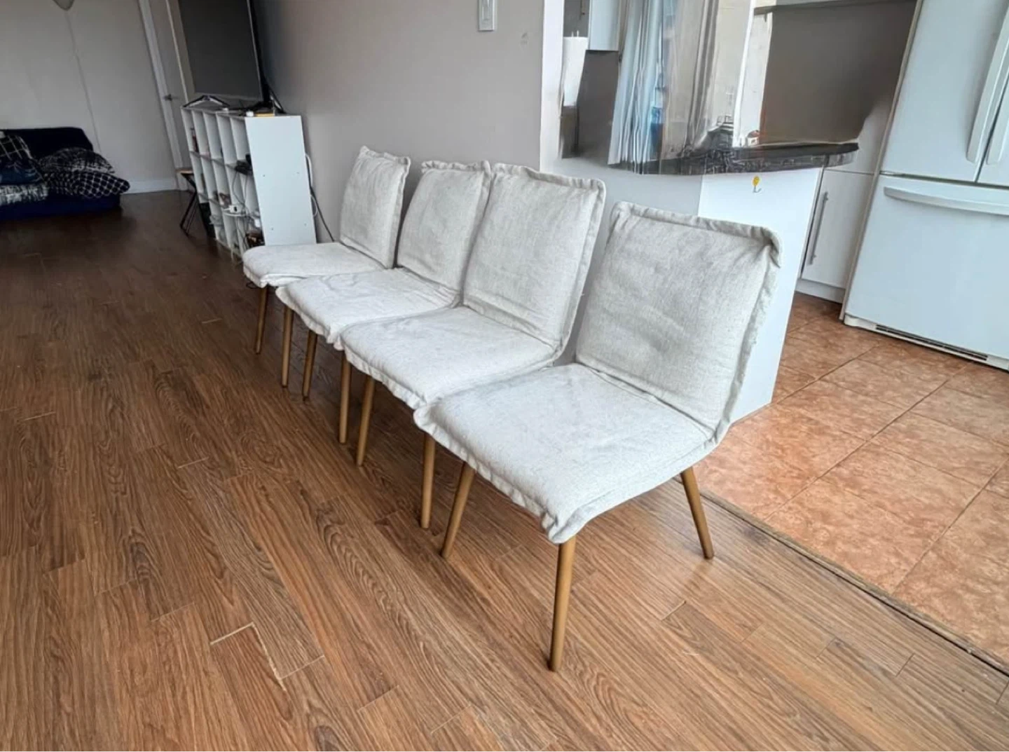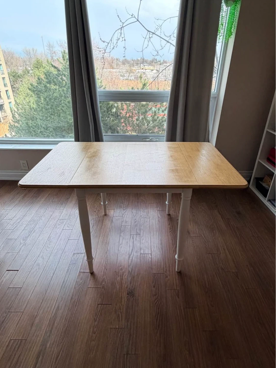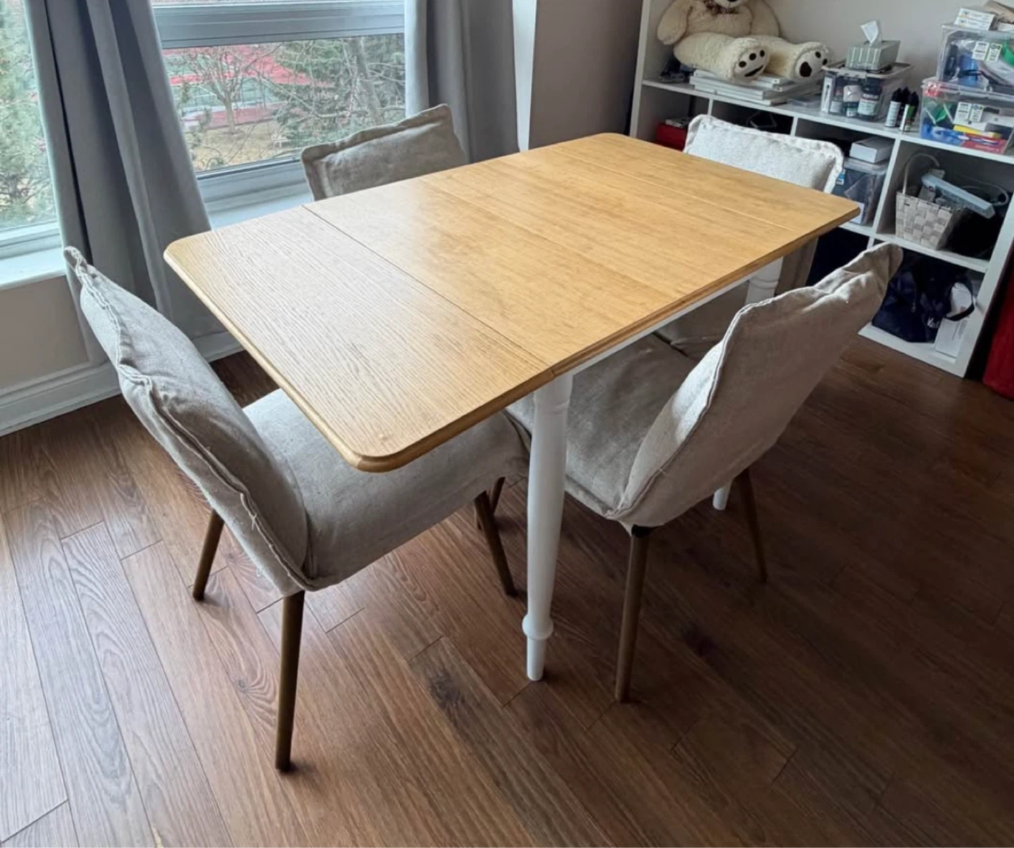 Versatile dining set. Drop-leaf table has light wood top and white base. Comes with 4 comfy chairs. Great for small spaces or when you need extra seating. And chairs cushion & covers removable and washable