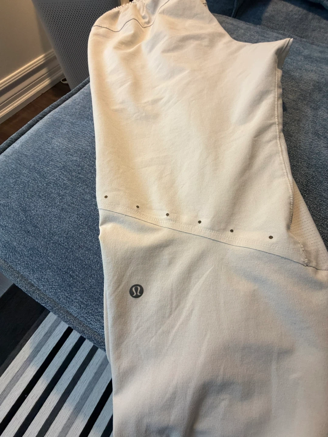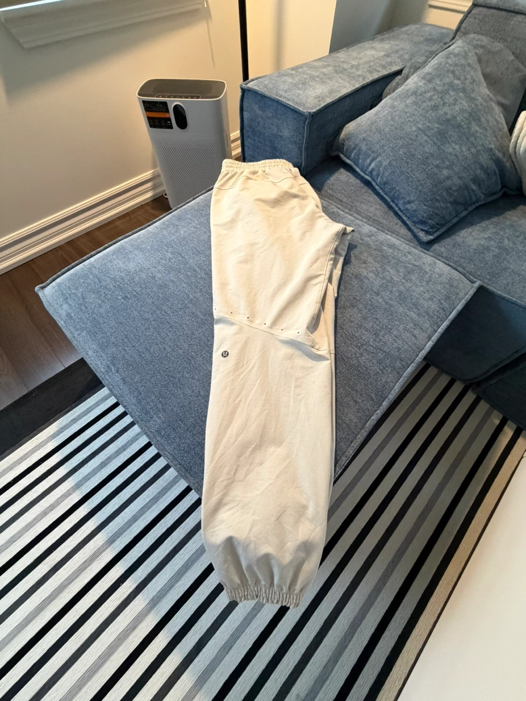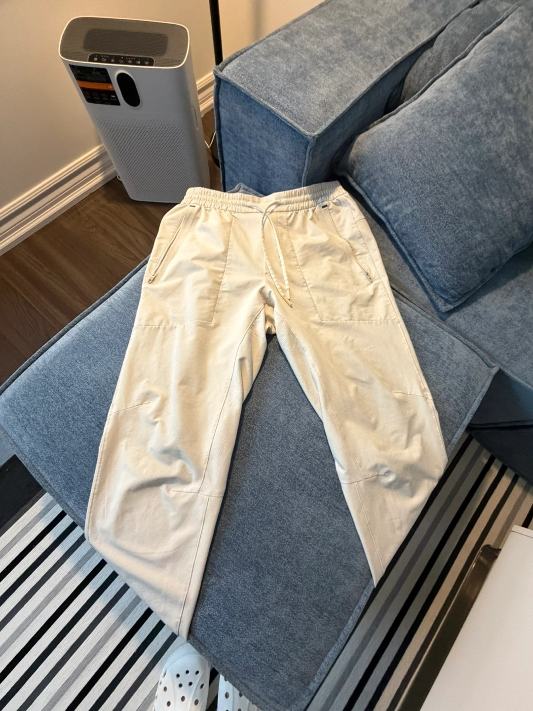 These Lululemon pants are a light beige colour. They feature an elastic waistband with a drawstring and pockets. They're made from a comfortable material.
