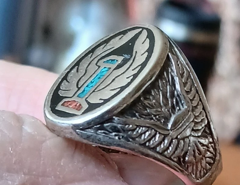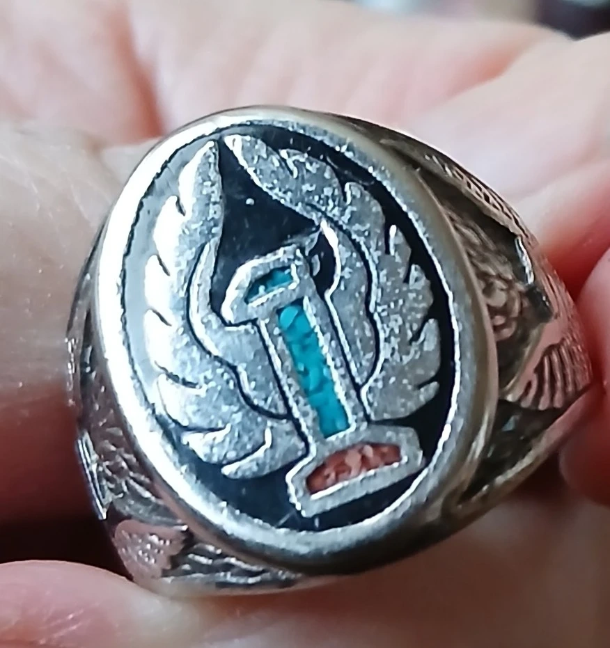 Vintage G&S biker ring 1986 inlaid with turquoise and red coral mens size 11 This would be a statement piece for someone who appreciates unique vintage jewellery.