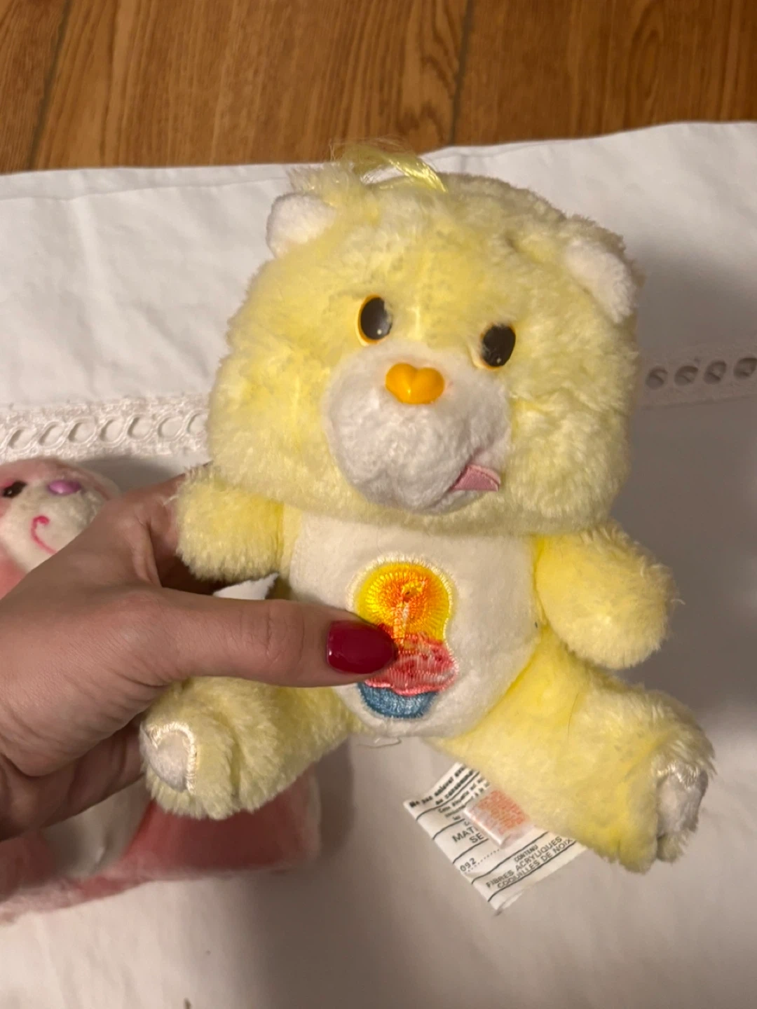 A pair of plush Care Bears toys, one pink and one yellow. The pink bear has two hearts on its tummy, and the yellow bear has a cupcake design. These soft, cuddly bears are ready for a new home!