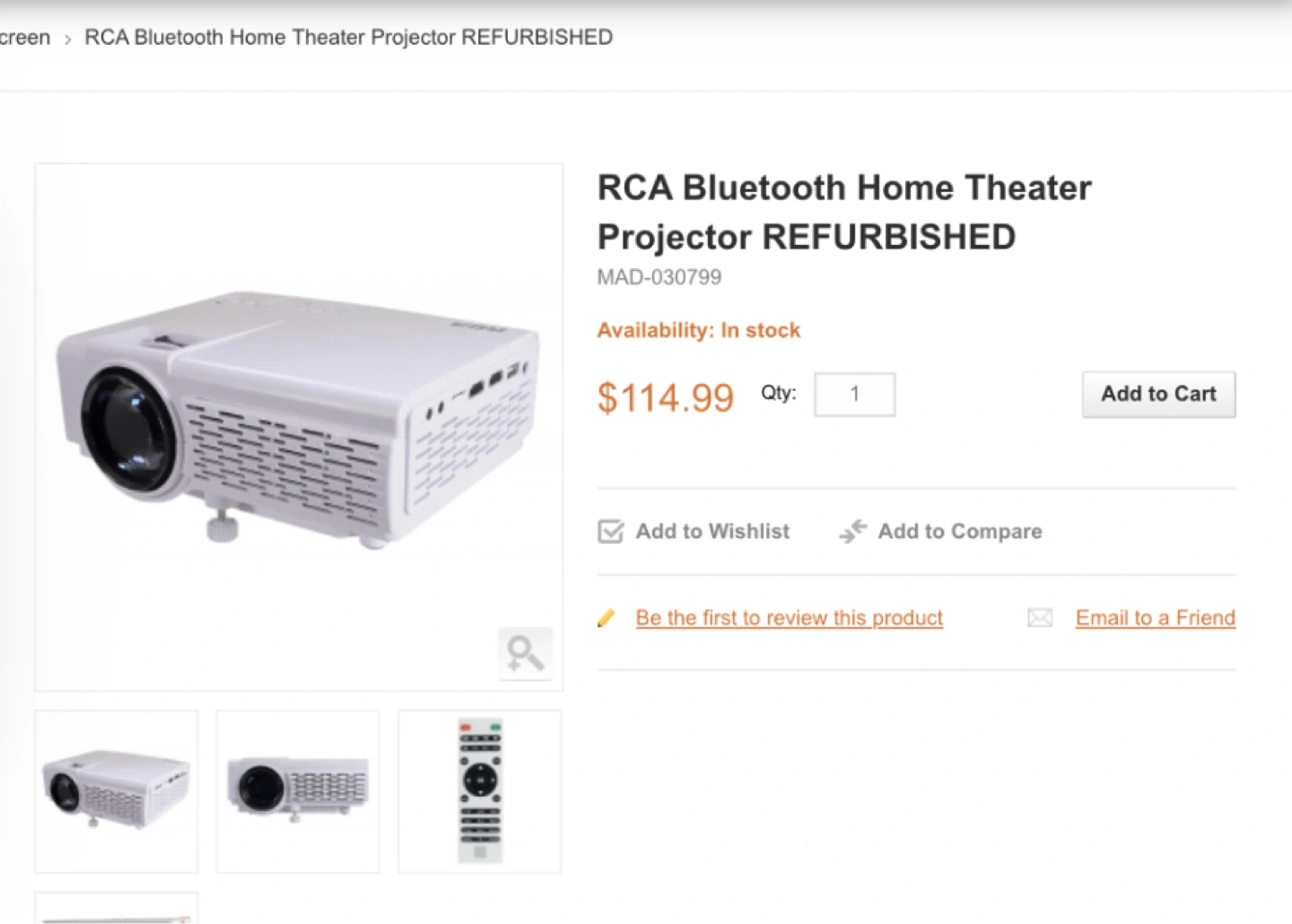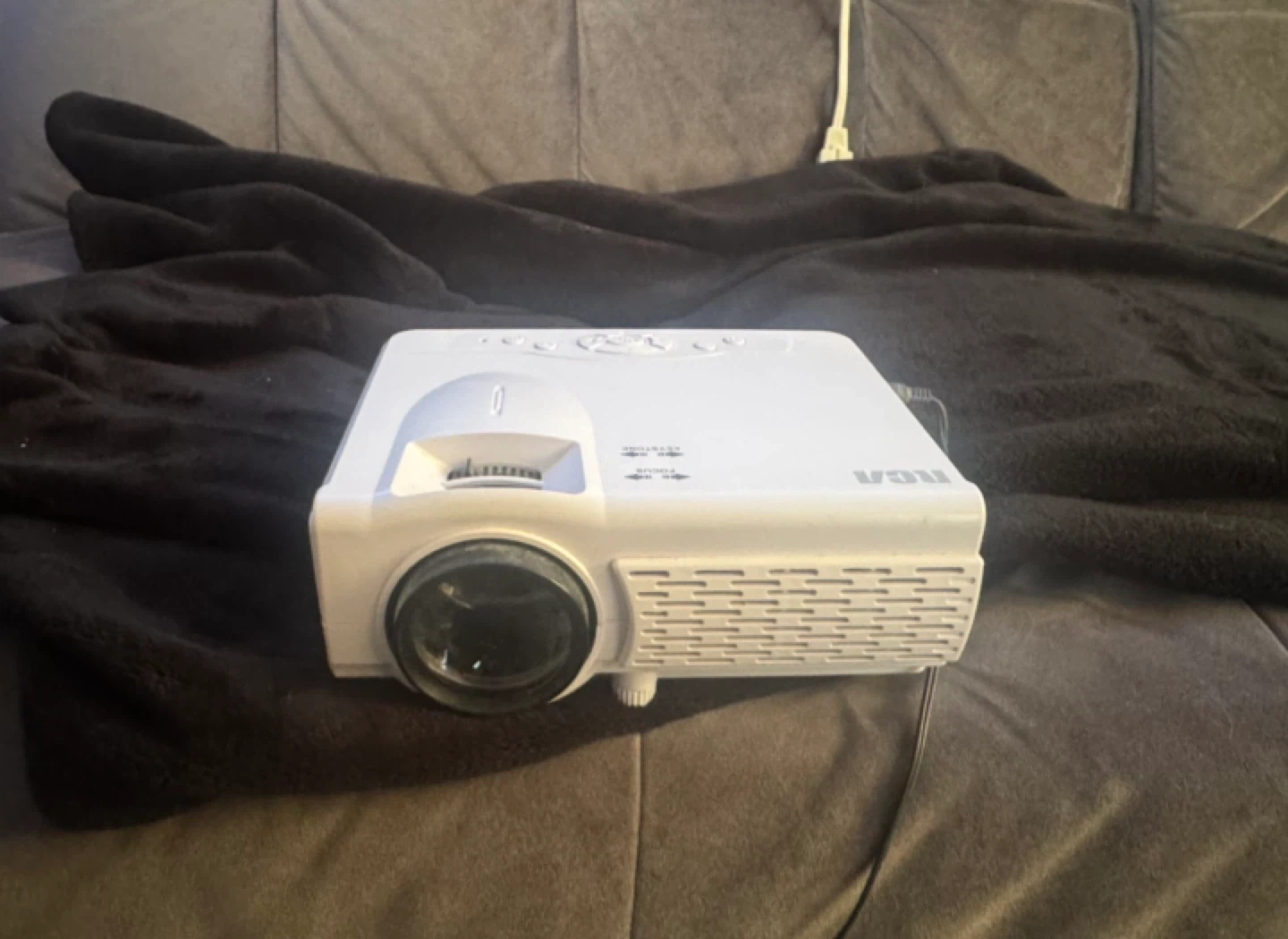 This RCA Bluetooth Home Theater Projector is white. It has keystone and focus adjustment wheels. This projector can be used for home entertainment. Never used