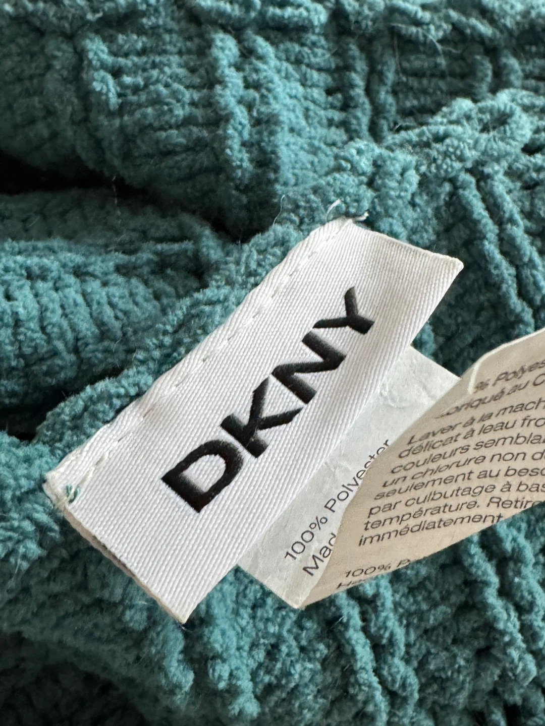 Cozy DKNY throw blanket in a deep teal colour.