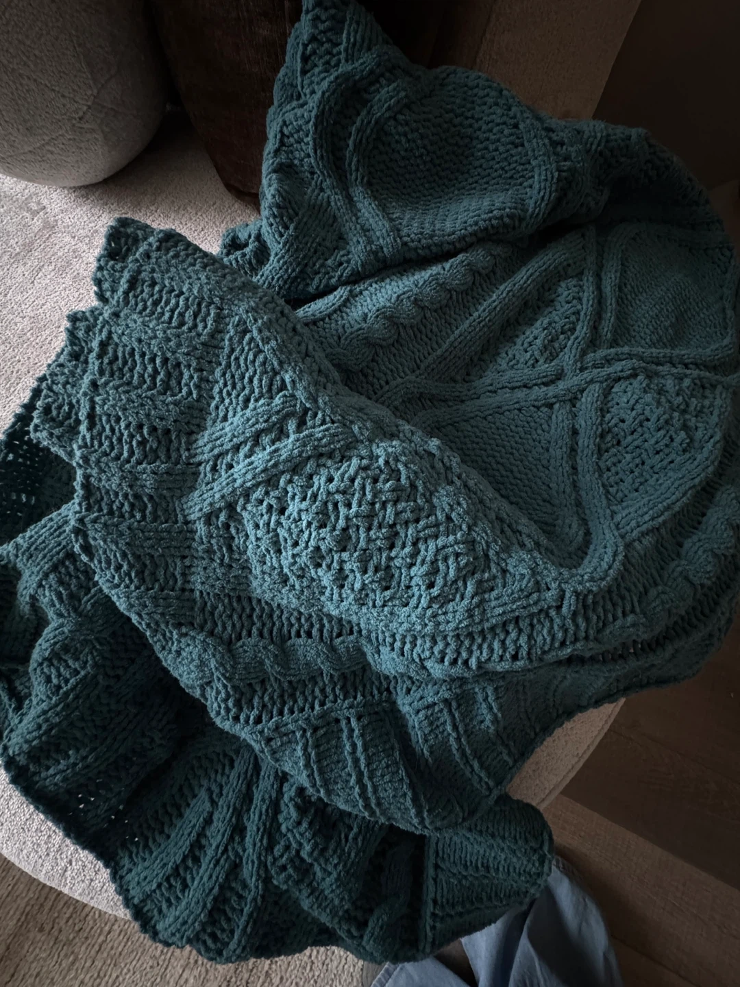 It's made of 100% polyester with a lovely chunky cable knit pattern.