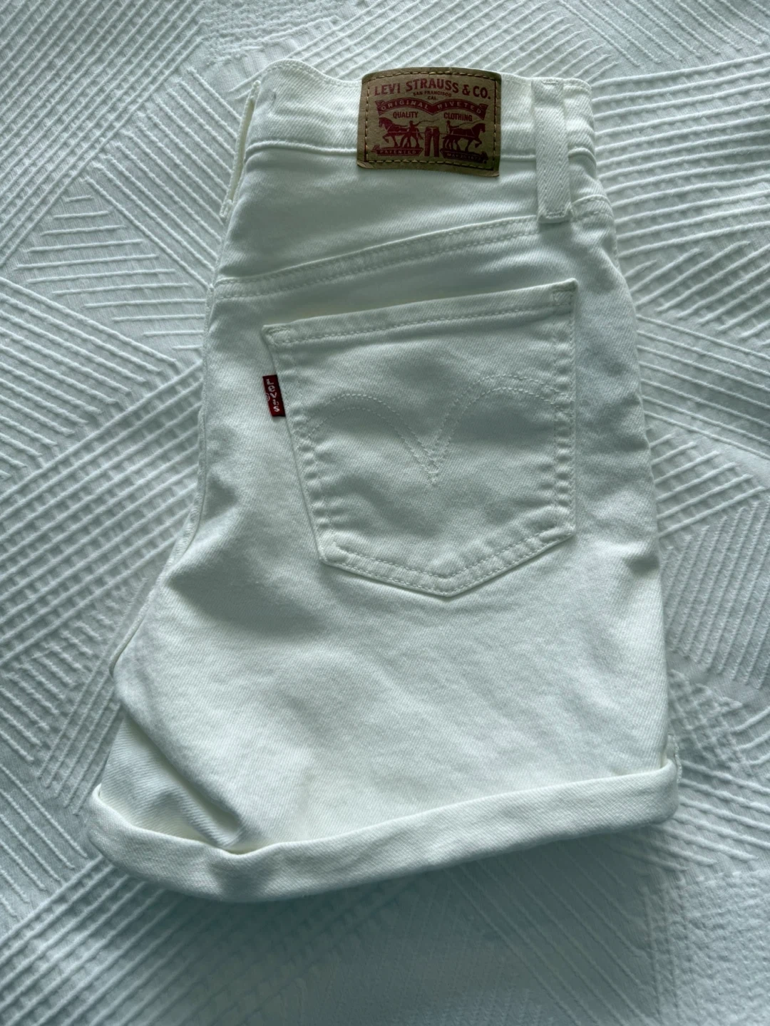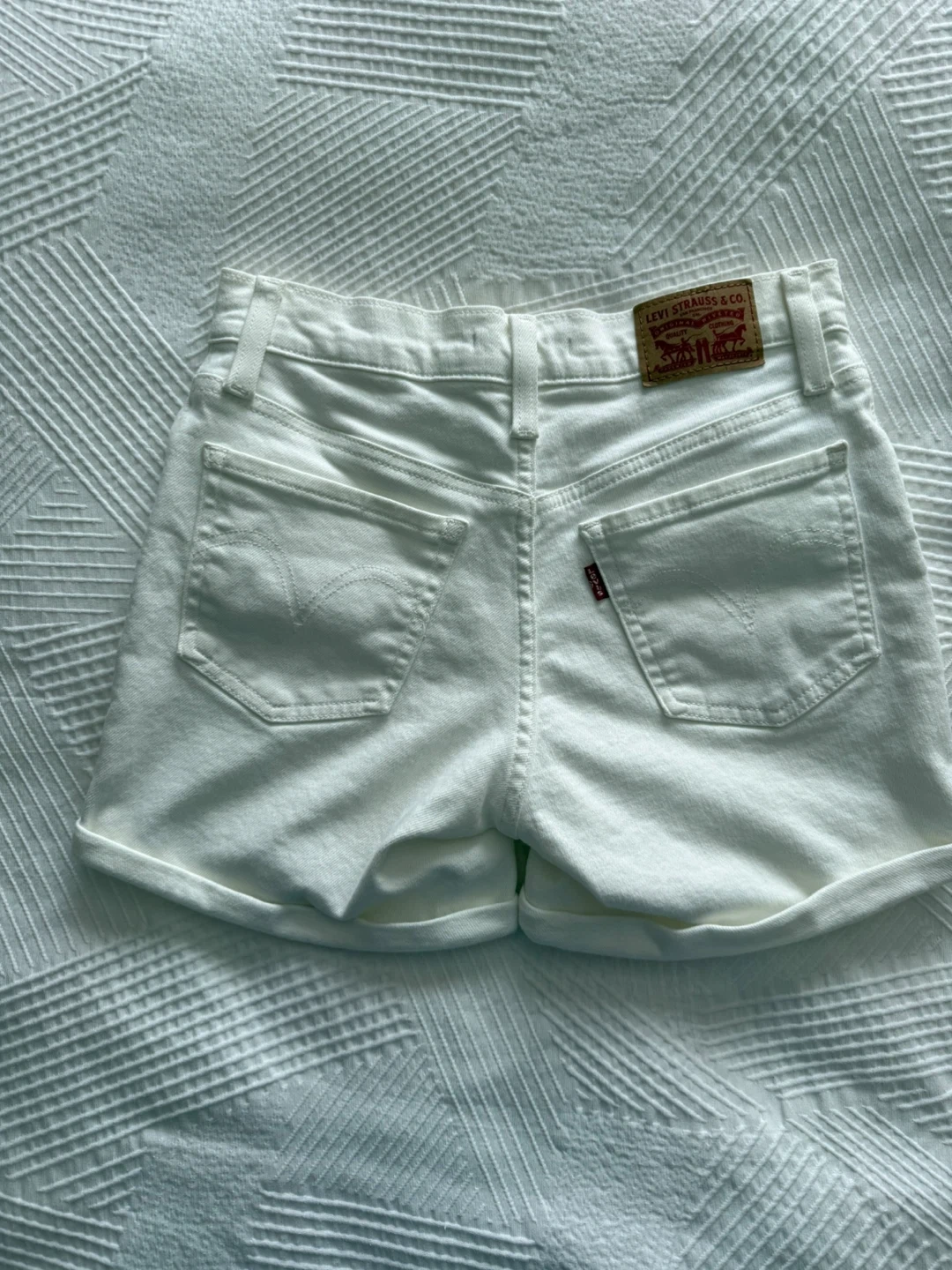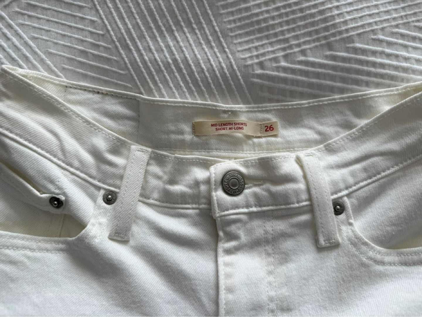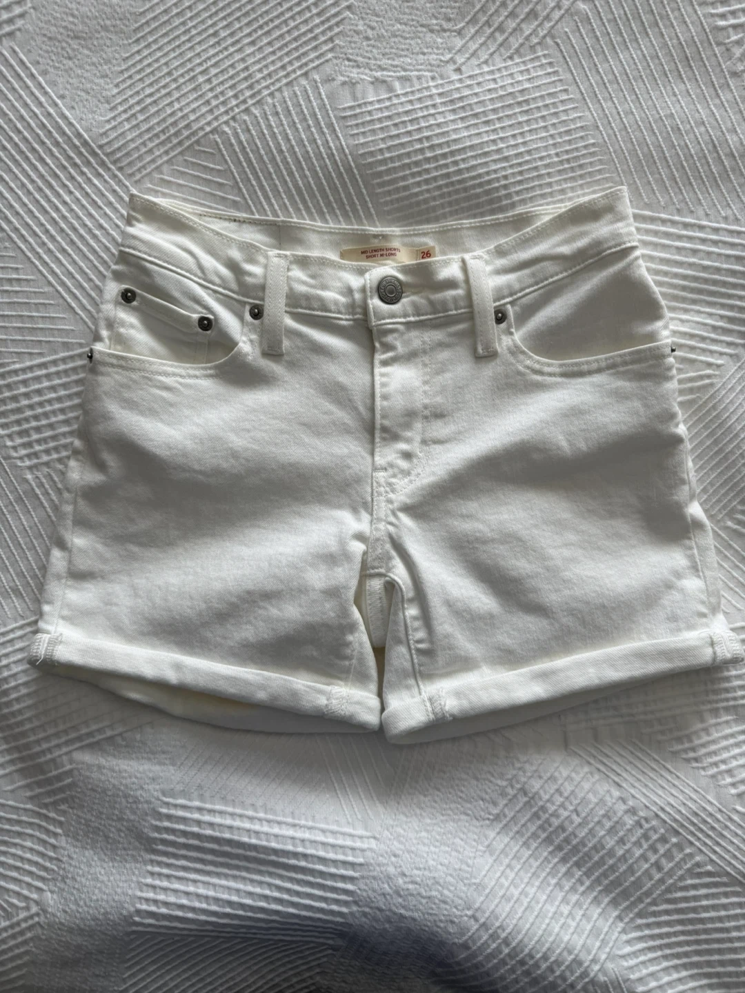 These are Levi Strauss & Co. mid-length denim shorts in white. Size is 26. New, never worn but took the price tag off. Perfect for warmer weather!