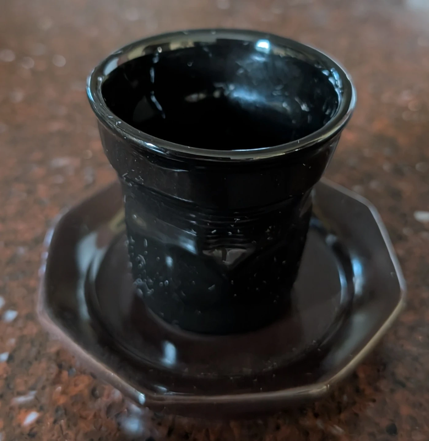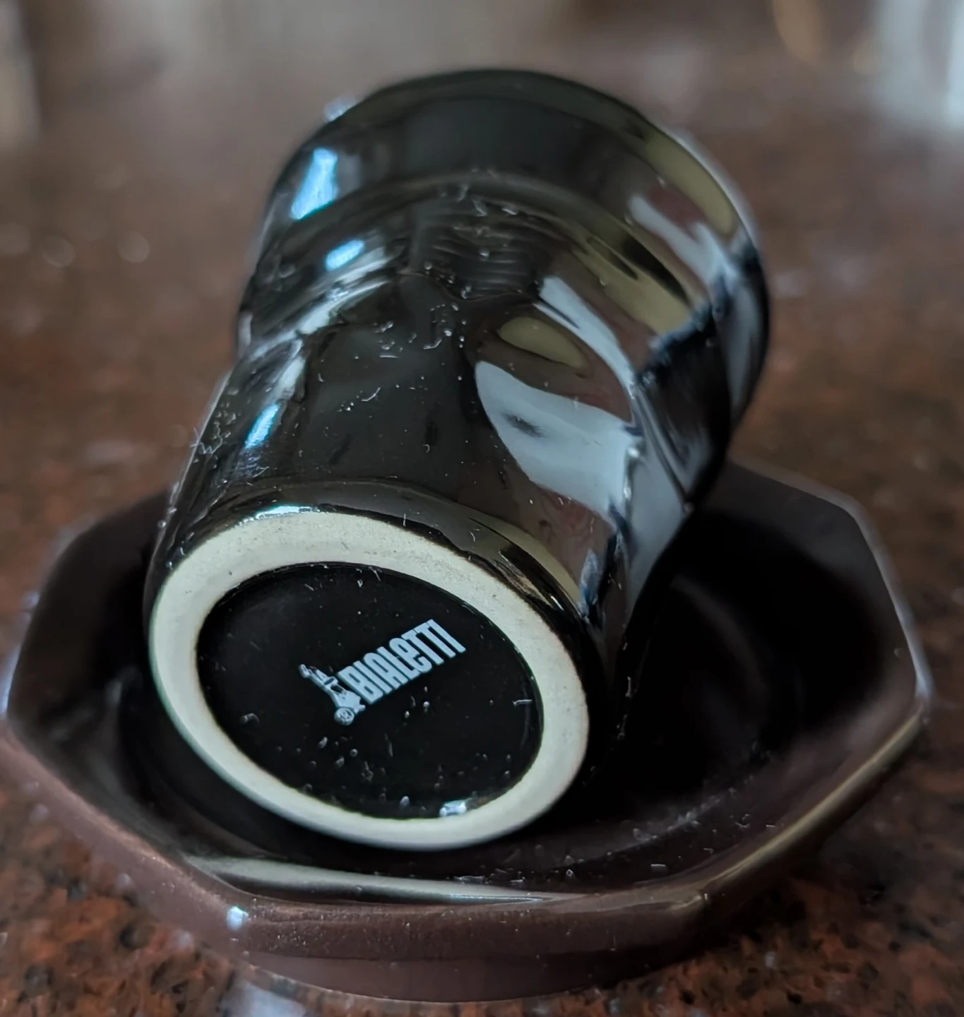 Black Bialetti espresso cup with a matching saucer. Ceramic material. This set's perfect for enjoying a morning espresso shot! Never used.