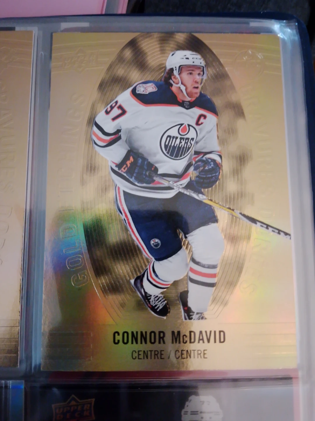 This is a Connor McDavid Centre/Center hockey card. It features a gold, textured background and shows him in his Edmonton Oilers uniform. The card is from Upper Deck.