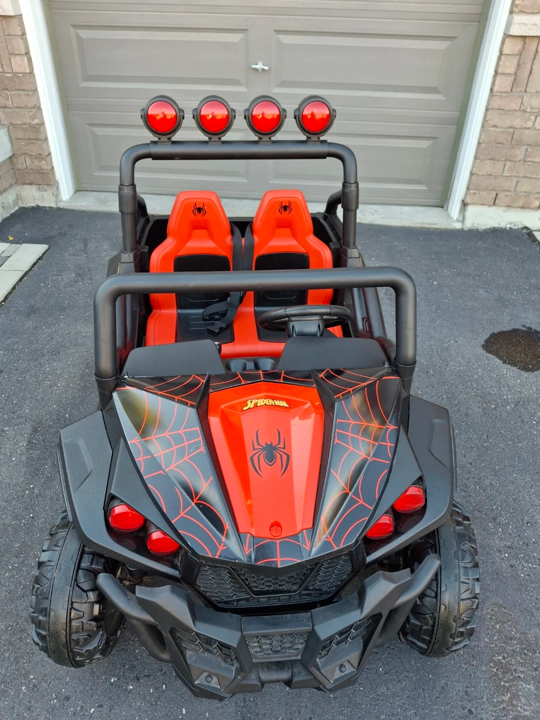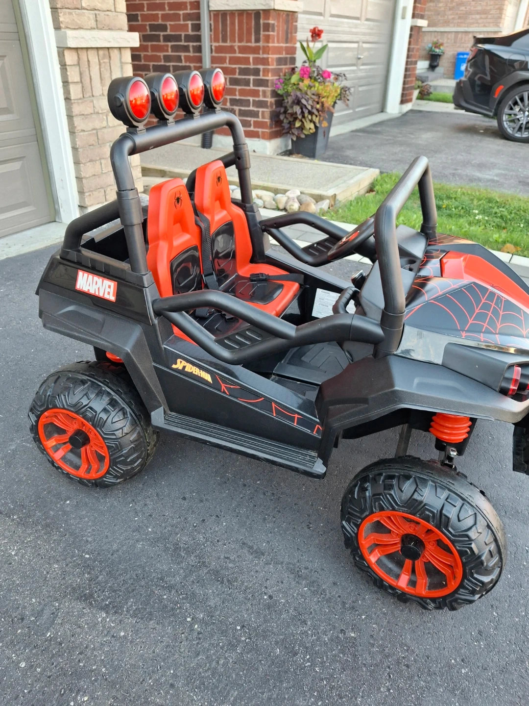 This Spider-Man ride-on toy car features a dual-seat design and a vibrant red and black colour scheme with web accents. It has a sturdy build with large off-road wheels and a roll bar with headlights. Includes seat belts for safety. Great for outdoor adventures!