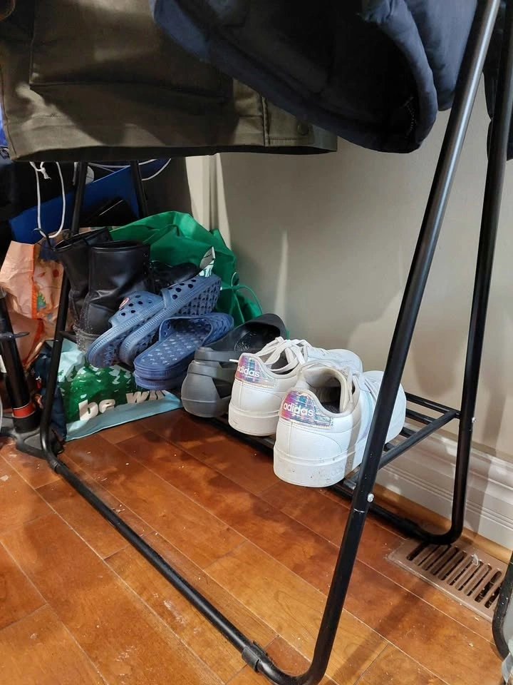 A black metal framed coat/garment rack with a bottom shelf for shoes or handbags, etc! Very lightweight and easy to move around the house if needed! No hangers included. We used it for our jackets and shoes so a light wipe might be needed if using for indoor garments.