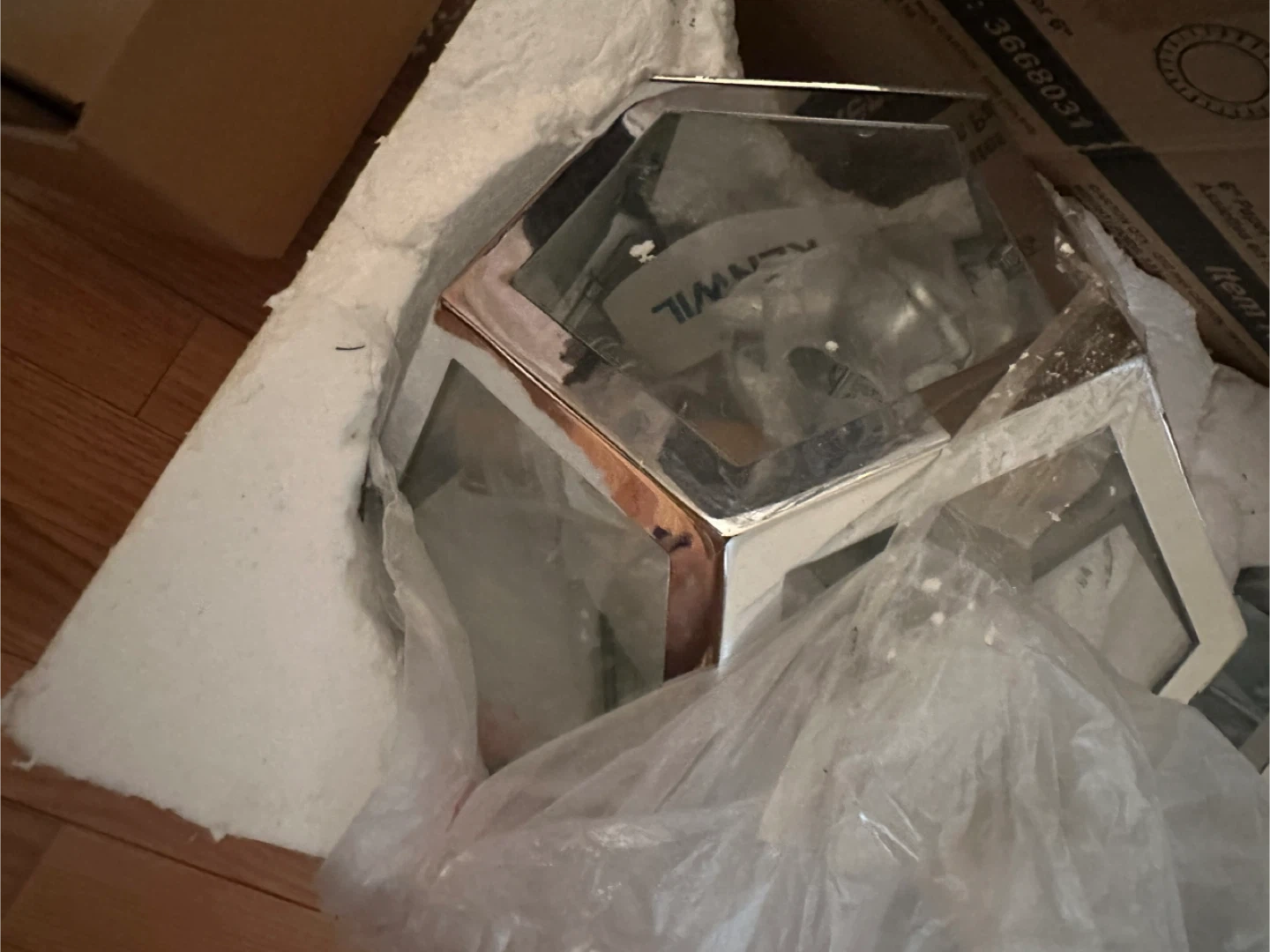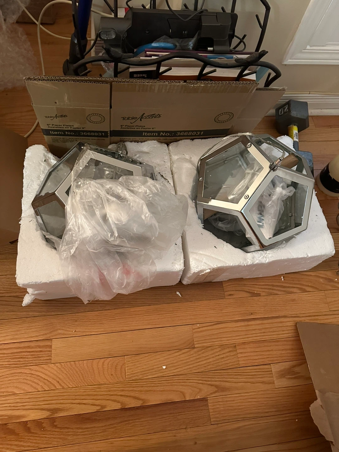 Two Renwil geometric lights with clear glass panels and a silver-tone metal frame. These decorative pieces would make a nice addition to any home's interior design. They are designed for decorative purposes (price is for each).