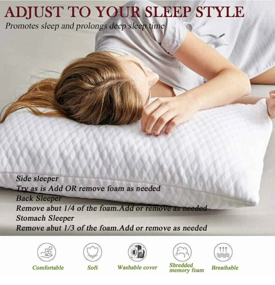 Shredded memory foam bed pillow for sleeping. Queen size (1-pack). Fabric is 100% polyester, keeping it breathable, dry, and softer. Pillow interior is filled with 100% high-quality broken memory foam that has high resilience and is not easy to deform. Easy to clean: just open the zipper, take out the memory foam to ventilate, and clean the fabric part. This keeps the liner clean and hygienic. No need to put the entire pillow in the washing machine. The product uses vacuum sealing to protect the elasticity of the foam. Feel free to message if you have any questions!