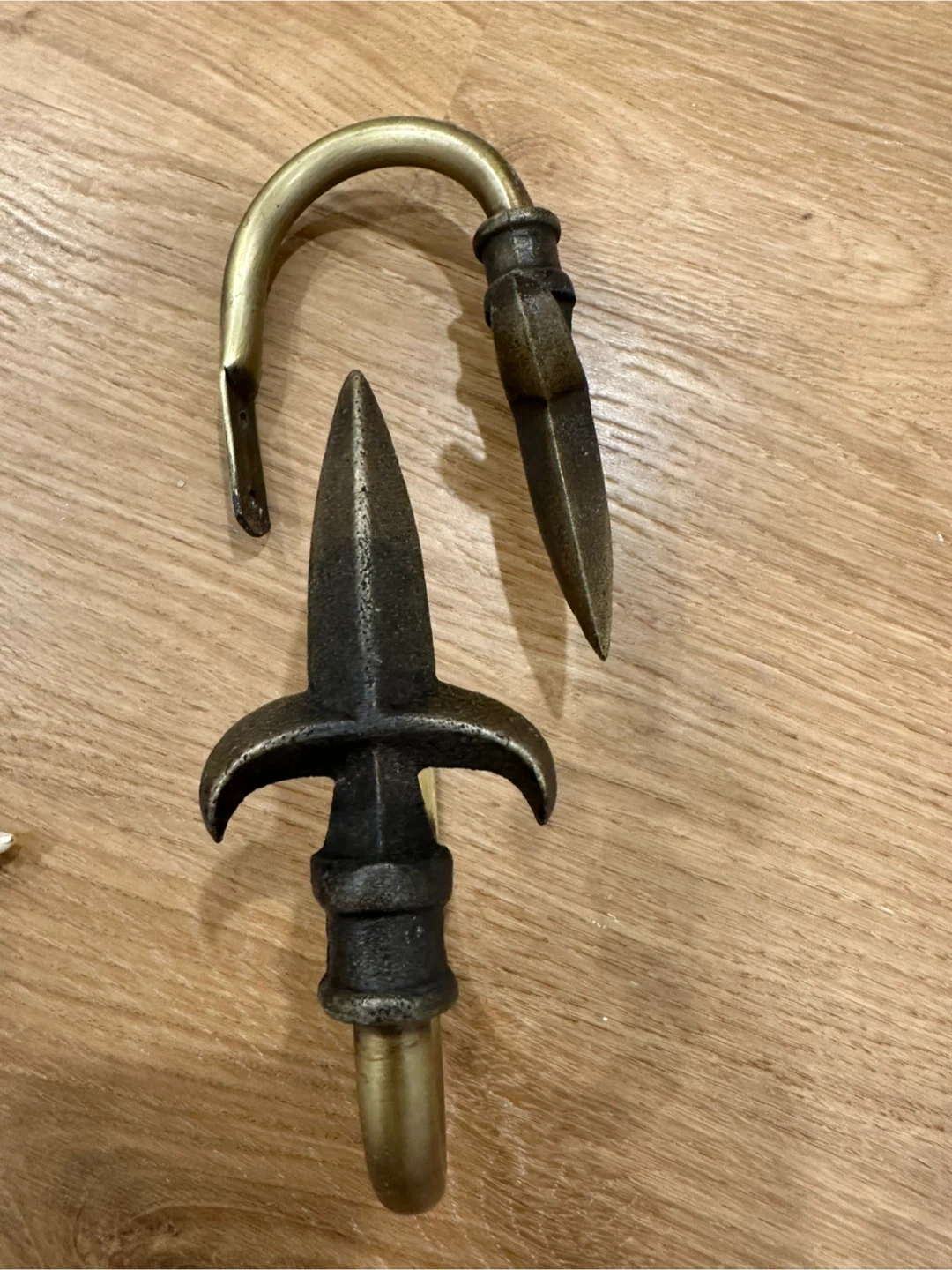 These are decorative curtain holdbacks. They're made of metal and come in a dark bronze finish. Two have a scroll design, and two have a more ornate, pointed end with a mounting plate. Hardware included for two. $5 per set. Or $10 for 2 sets.