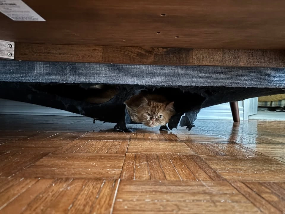 Decorative pillows included. There's a hole/cat hammock in the bottom of the couch (photo included). Selling as-is, pick-up only. Yonge/Sheppard area.