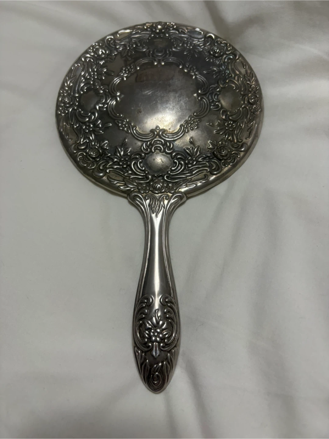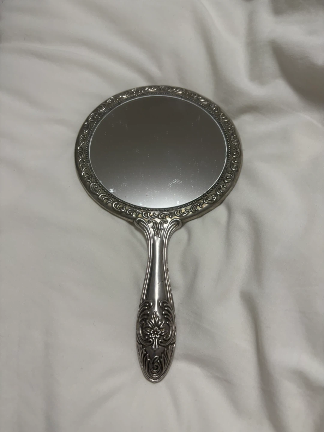 This vintage-style handheld mirror features a perfect mirror reflective surface and a beautifully detailed handle. The metal frame and handle are embellished with an intricate floral and scroll pattern. It's a lovely piece for personal use or display.