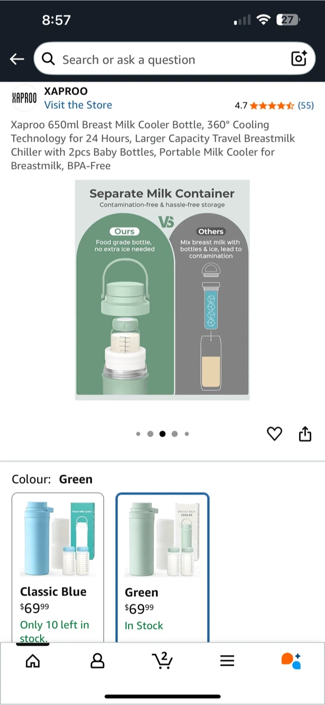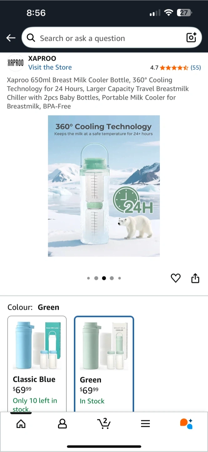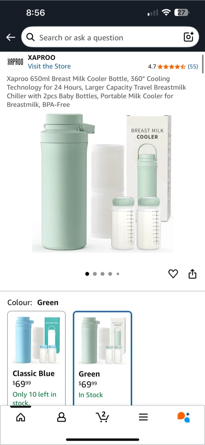 1000+Selling a Xaproo 650ml breast milk cooler bottle in green! It features 360° cooling technology for 24 hours. It's a larger capacity travel breastmilk chiller with 2pcs baby bottles, and is a portable milk cooler for breastmilk. BPA-Free New without box