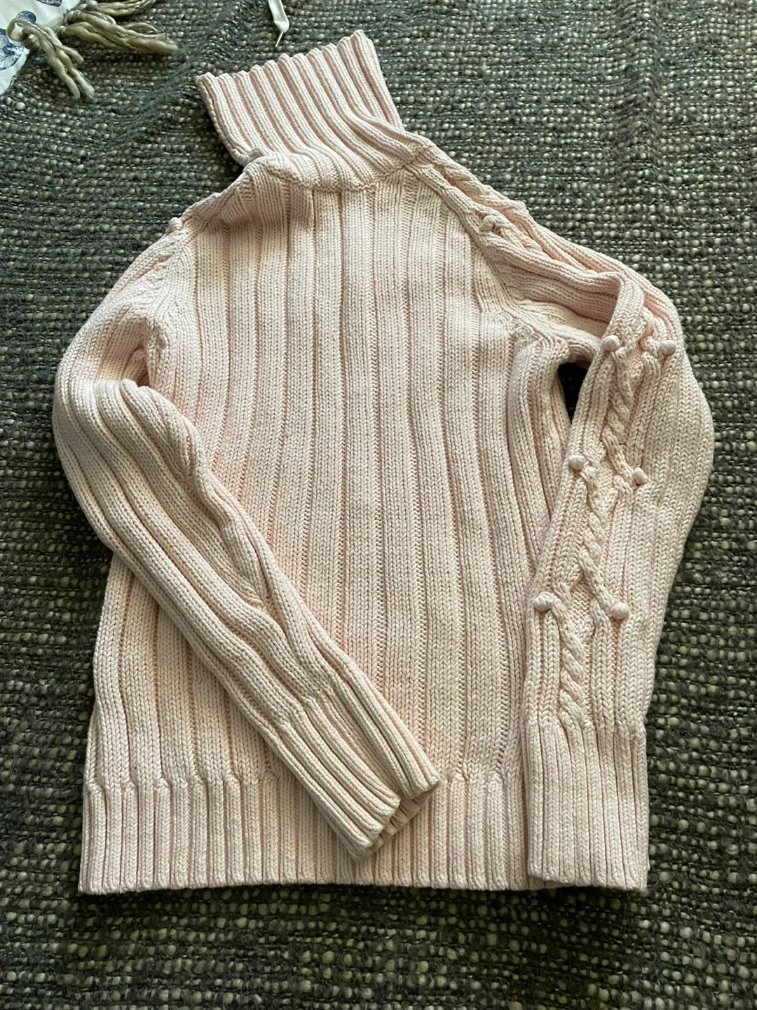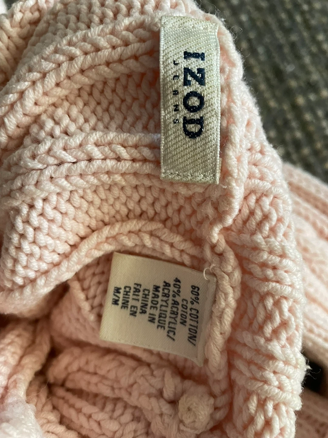 š„IZOD pink cable knit turtleneck sweater. Features a detailed cable knit pattern with bobbles. Made from a cotton and acrylic blend. Size medium.