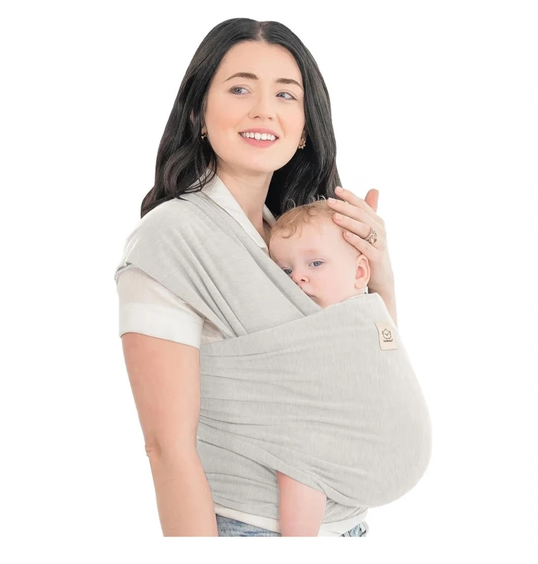 KeaBabies Original Baby Wrap Carrier in a soft grey colour. This wrap is suitable for babies from birth up to 36 months and for weights between 7-35 lbs. It's made from a comfortable, stretchy fabric to keep your little one snug. This carrier is great for keeping your baby close while you're on the go!