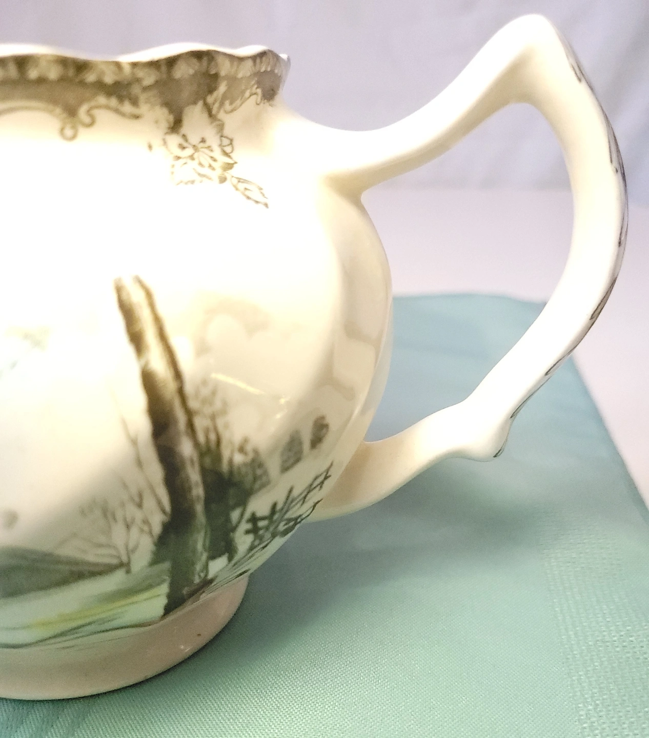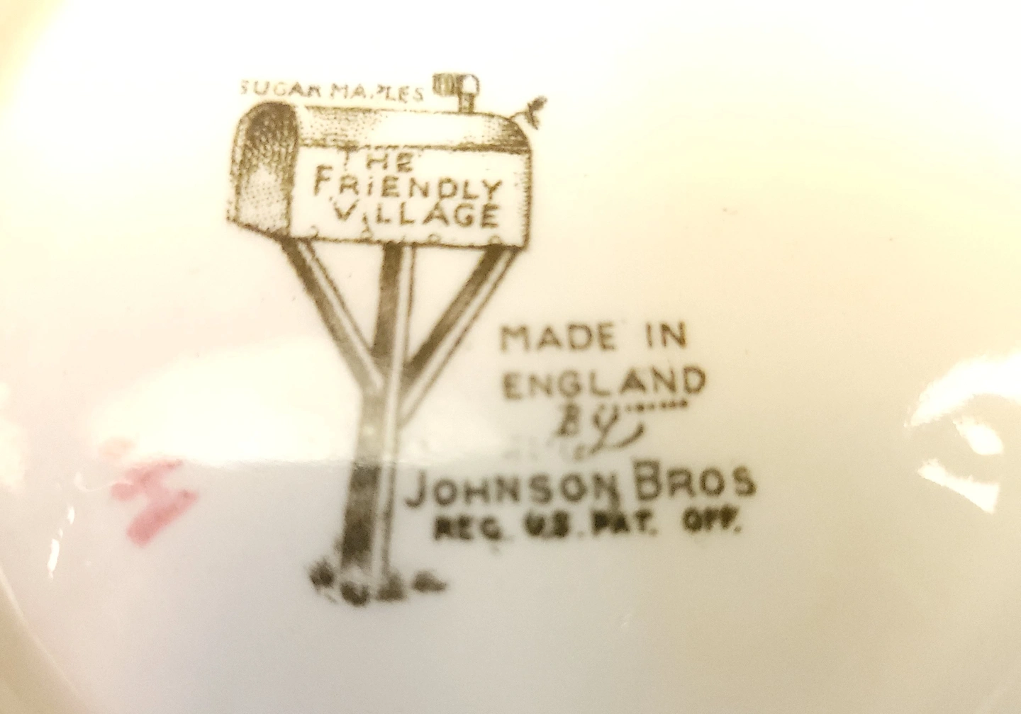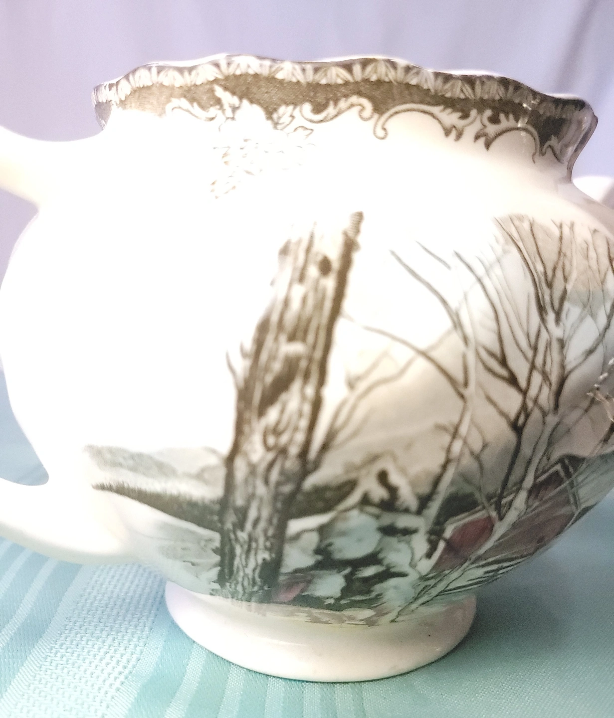 This is an authentic vintage teapot from Johnson Brothers in the iconic The Friendly Village pattern. This piece features the "Sugar Maples" scene, which is the quintessential winter design of the collection. This is an original English-made piece, featuring the classic mailbox backstamp used shortly after the pattern's debut in 1953.