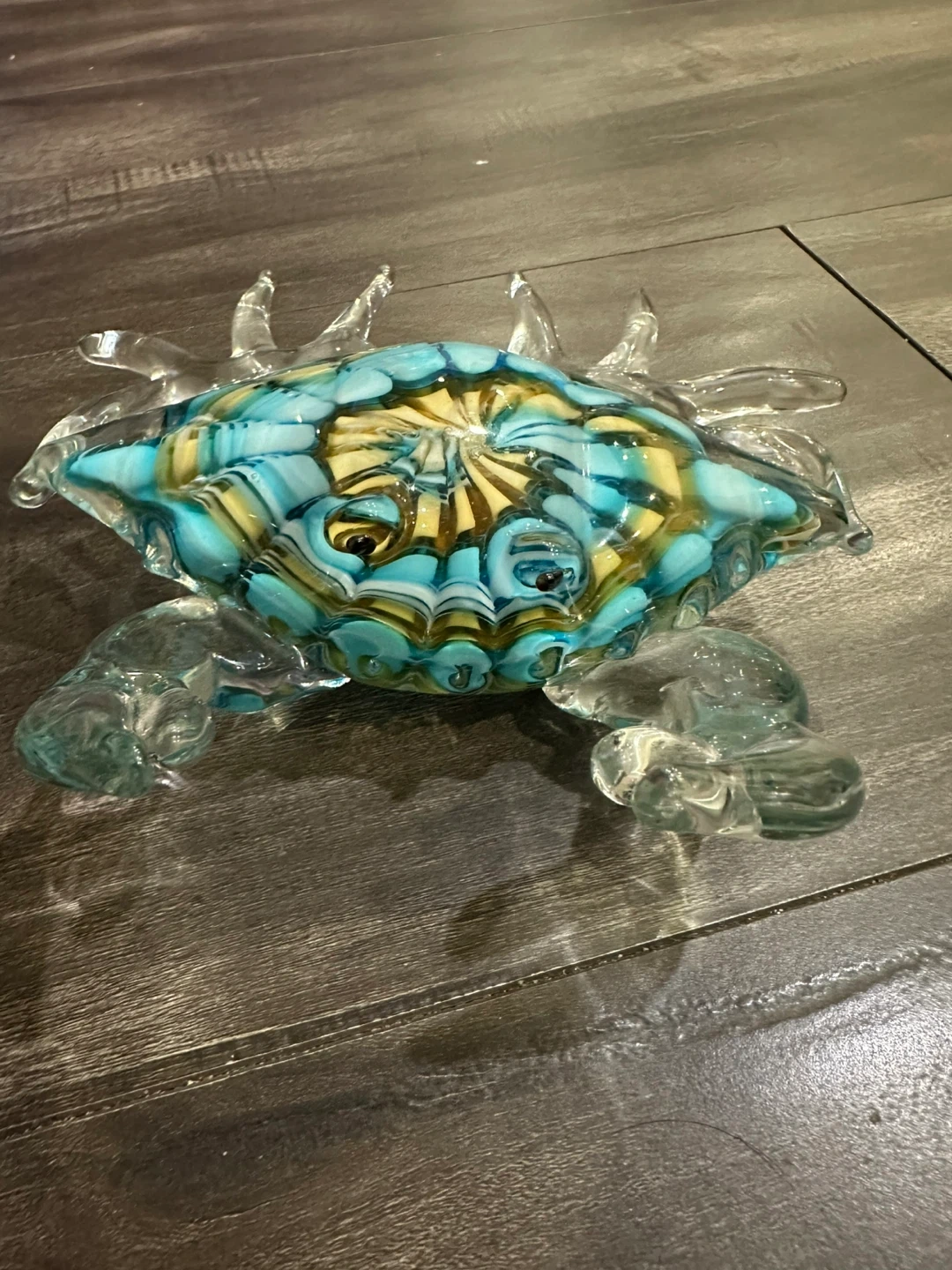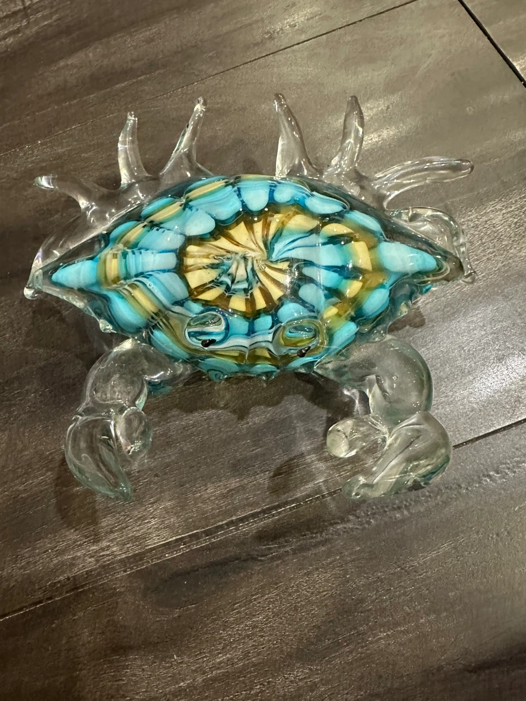 Decorative glass crab figurine. Features a vibrant blue, yellow, and clear glass design. Measures approximately 6 inches long and 5 inches wide.