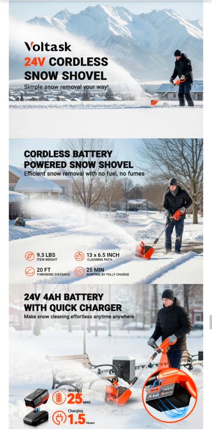 VOLTASK Cordless Snow Shovel, 24V | 13-Inch | 4-Ah Cordless
