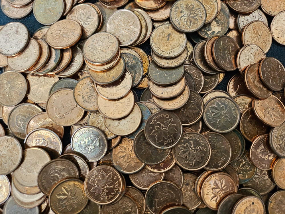 A collection of Canadian coins, including pennies from various years. They feature the iconic maple leaf design
