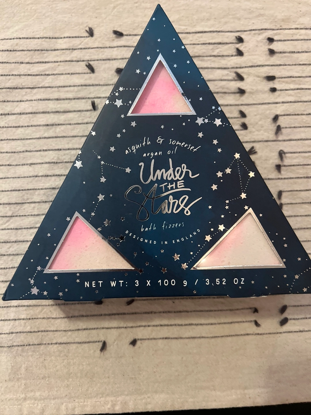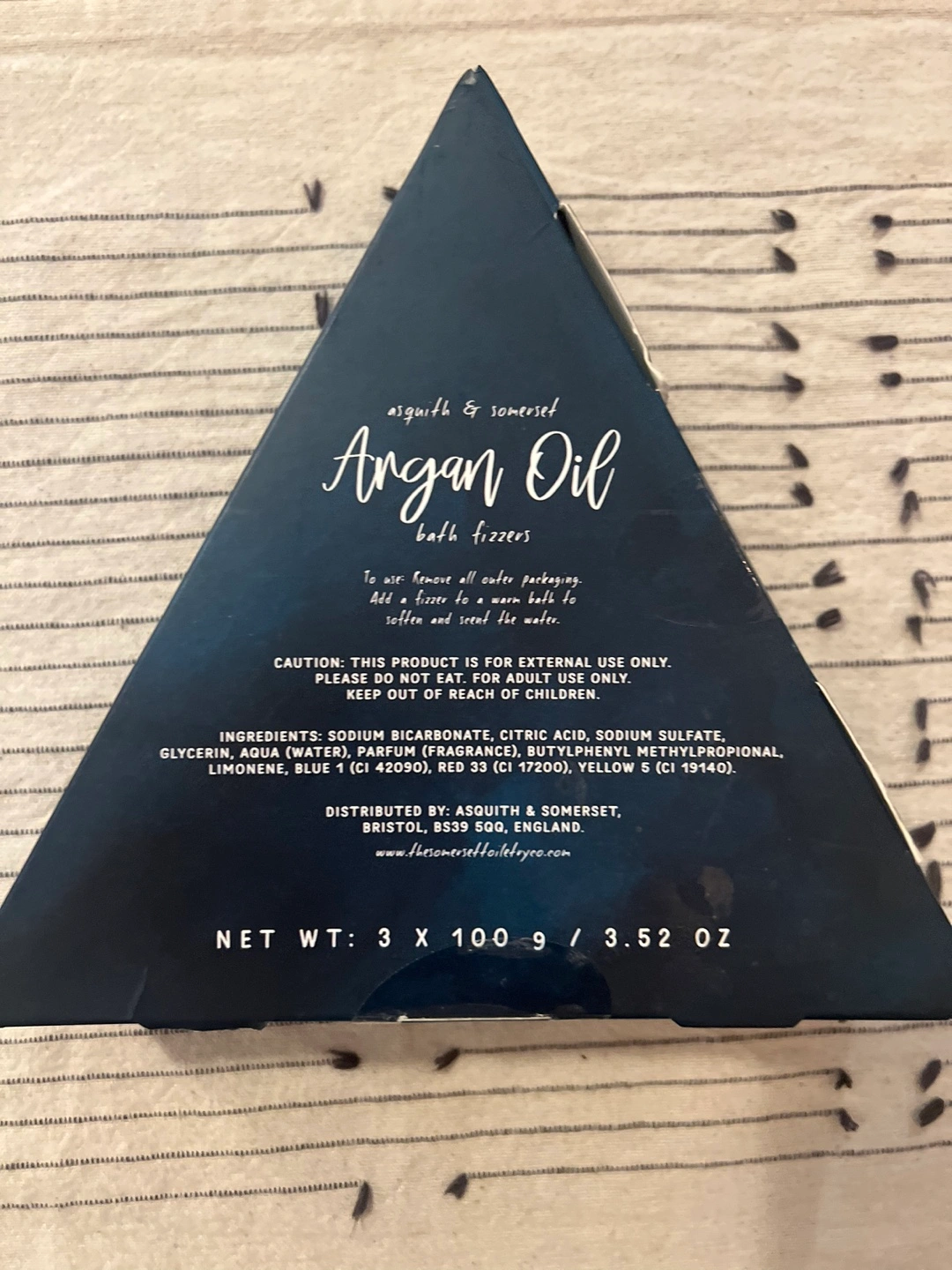 Three bath fizzers in a triangular box. Argan oil infused. Designed in England. Net weight 3 x 100g / 3.52 oz.
