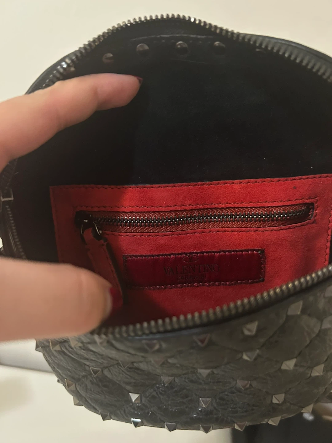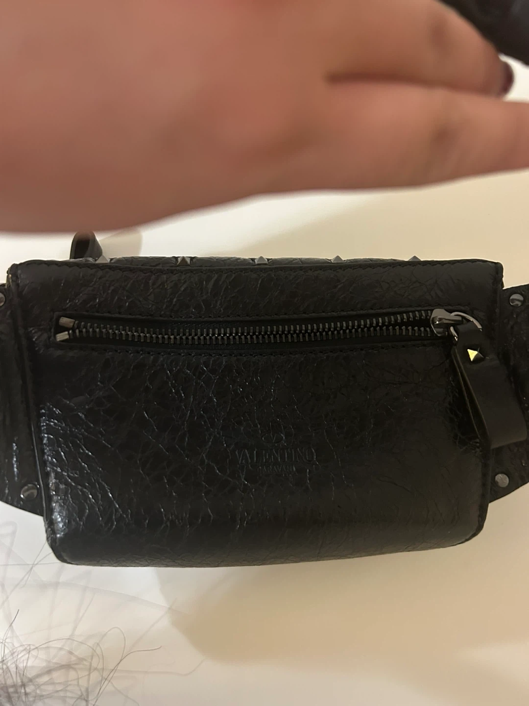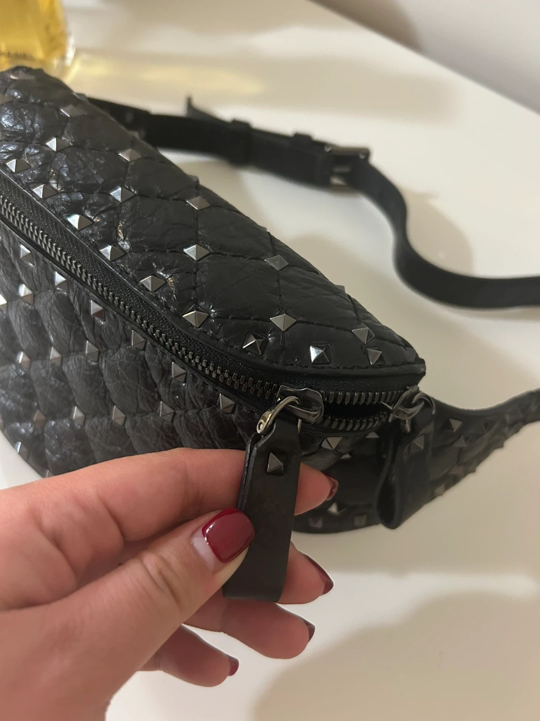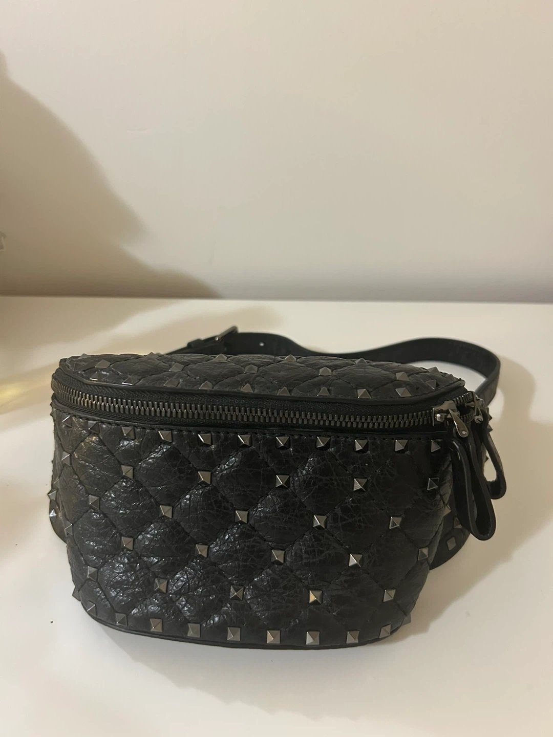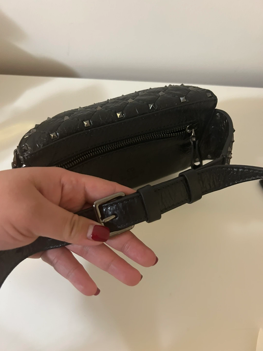 Valentino black leather belt bag with signature stud detailing. It features a zippered main compartment and an interior red suede lining. This bag is perfect for carrying essentials hands-free.never use
