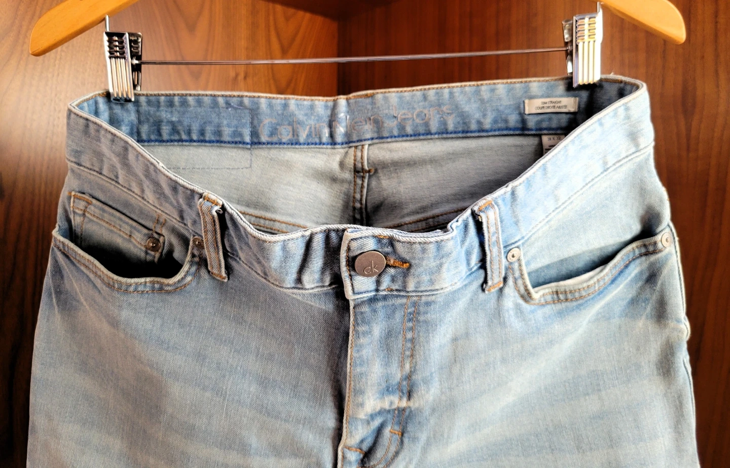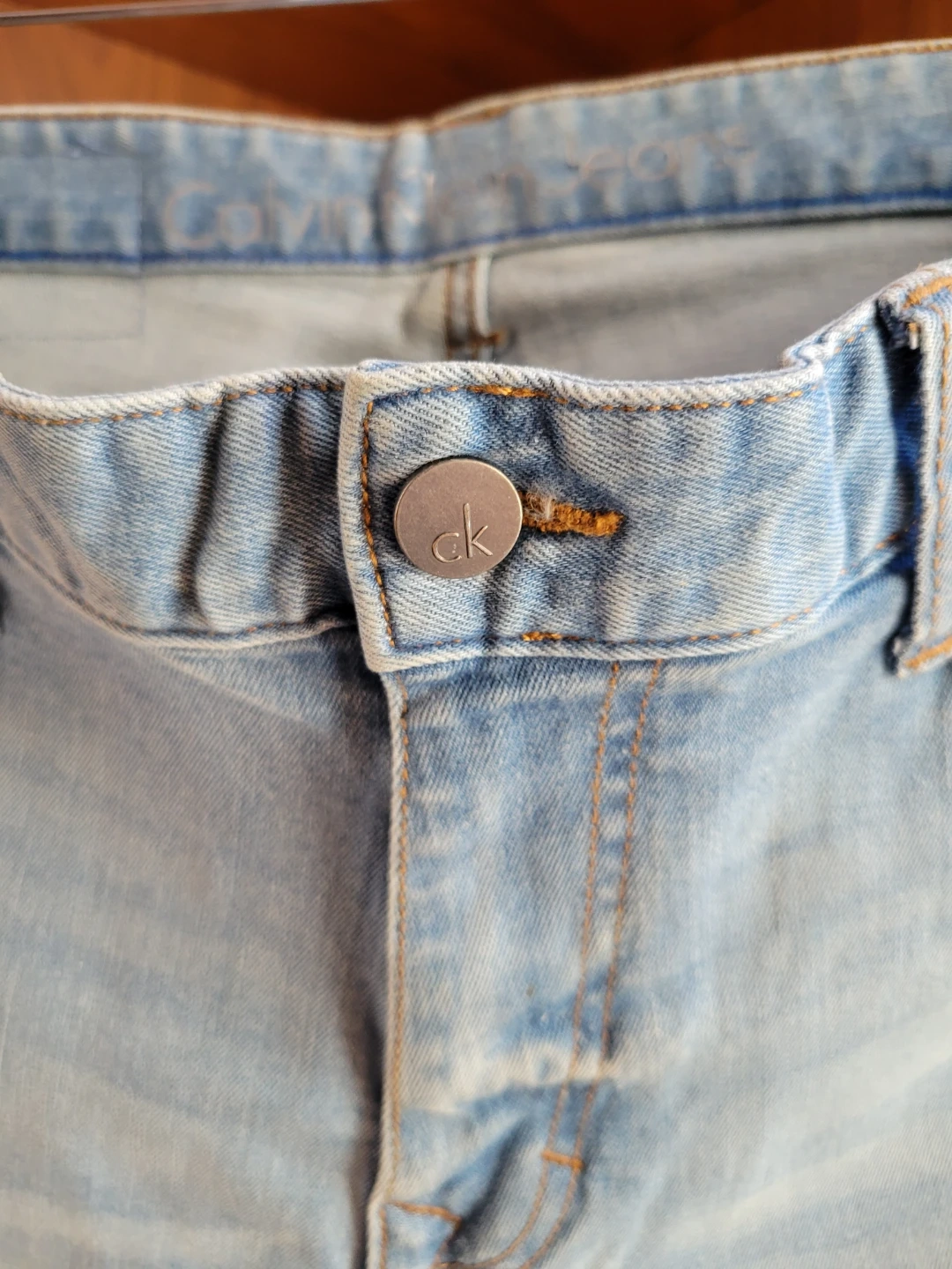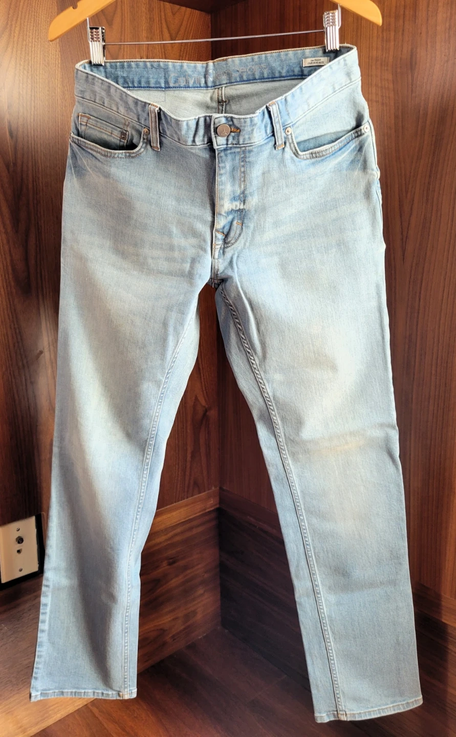 As new unworn men's Calvin Klein light stone wash jeans. These are size 31x32 and are a slim fit with a little stretch. No marks or damage.