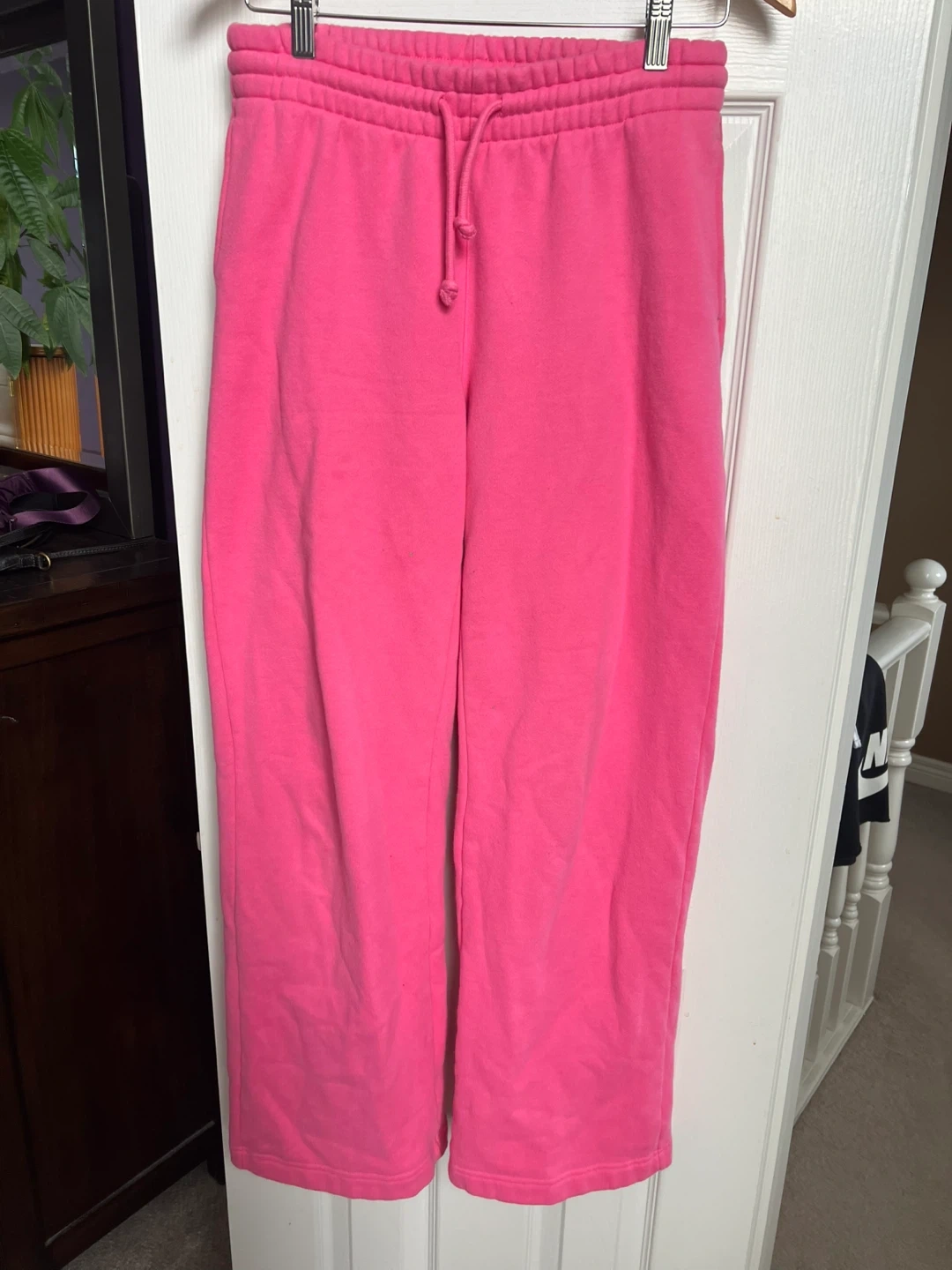 These are bright pink Tna sweatpants. They're a size small and made from cozy fleece material. They have an elastic waistband with a drawstring and a relaxed boyfriend fit.