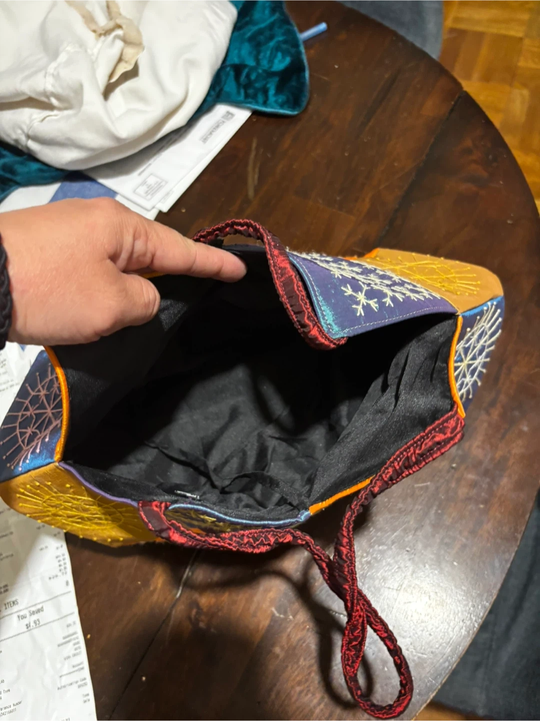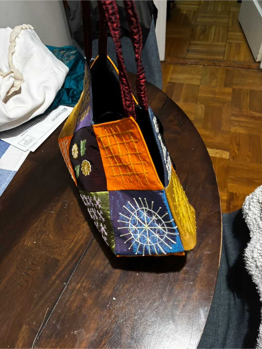 Quirky and colorful patchwork shoulder bag. Features intricate embroidery on various fabric panels. Bag is about 14 inches tall and 12 inches wide at its widest point. The straps are braided red cord.