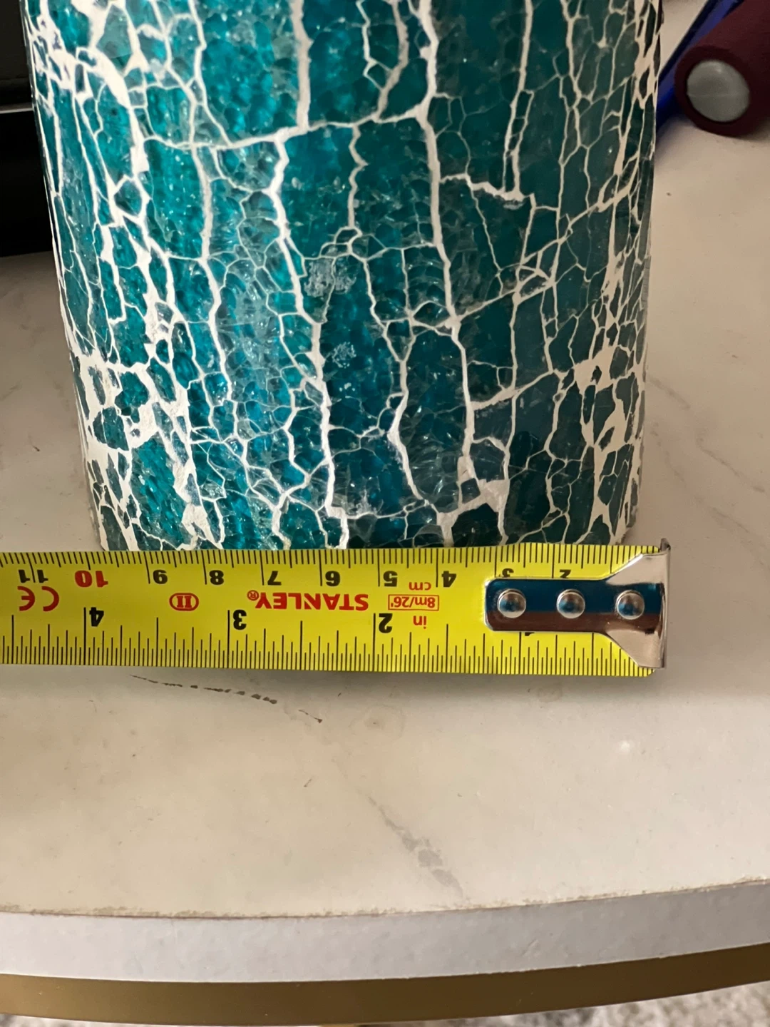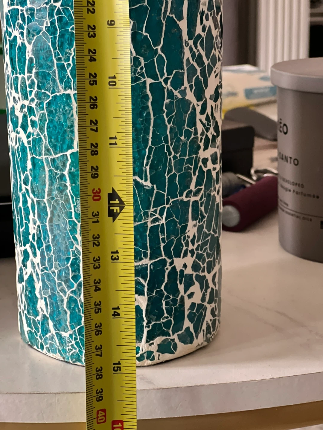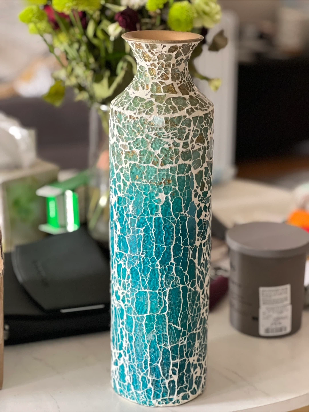 Tall vase with a teal and white crackle mosaic finish. It's approximately 15 inches tall. This decorative piece adds a touch of style to any room. It's suitable for displaying flowers or as a standalone decor item.