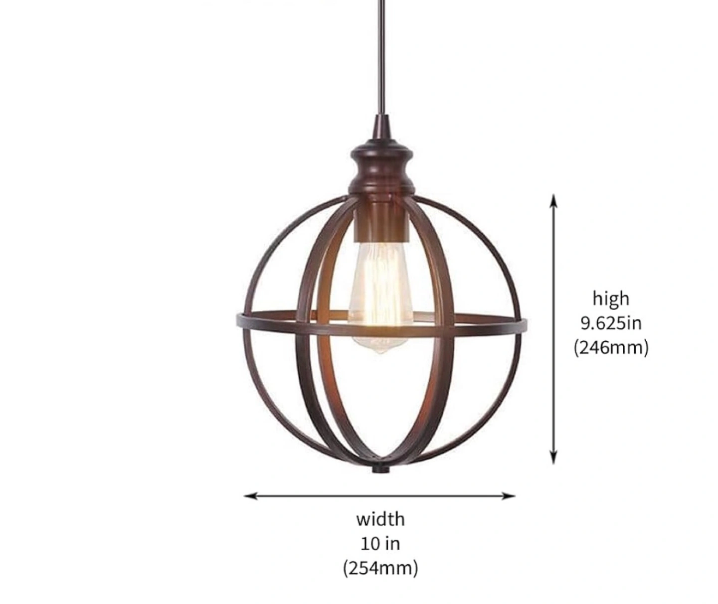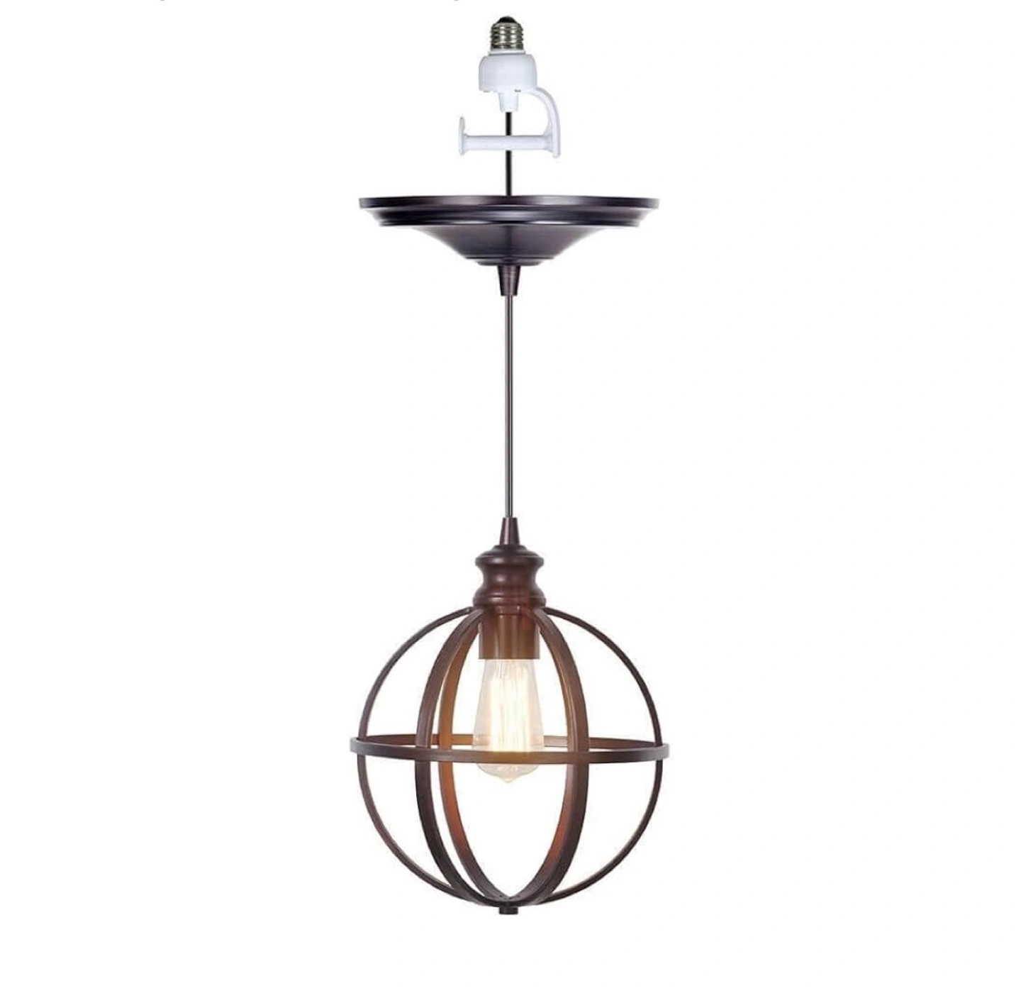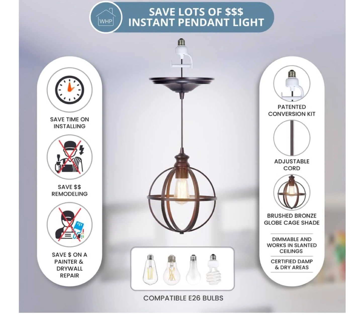Easy installation pendant light. Compatible with E26 bulbs. Dimmable and works in slanted ceilings. Brushed bronze finish. Globe cage shade.