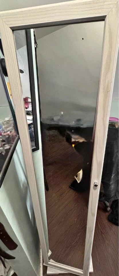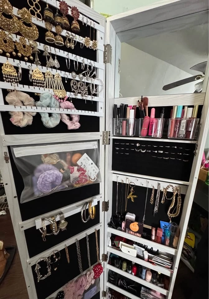 White full-length mirror jewelry cabinet in very good condition. This listing is for the mirror cabinet only — jewelry, makeup, and accessories are NOT included. Features: Full-size mirror, Hidden storage behind the mirror, Necklace hooks, earring slots & ring holders, Shelves and compartments for storage, Wall-mount or door-mount design, Strong wooden frame with smooth opening door. Great for organizing jewelry while saving space in your room. Selling because I don’t need it anymore.