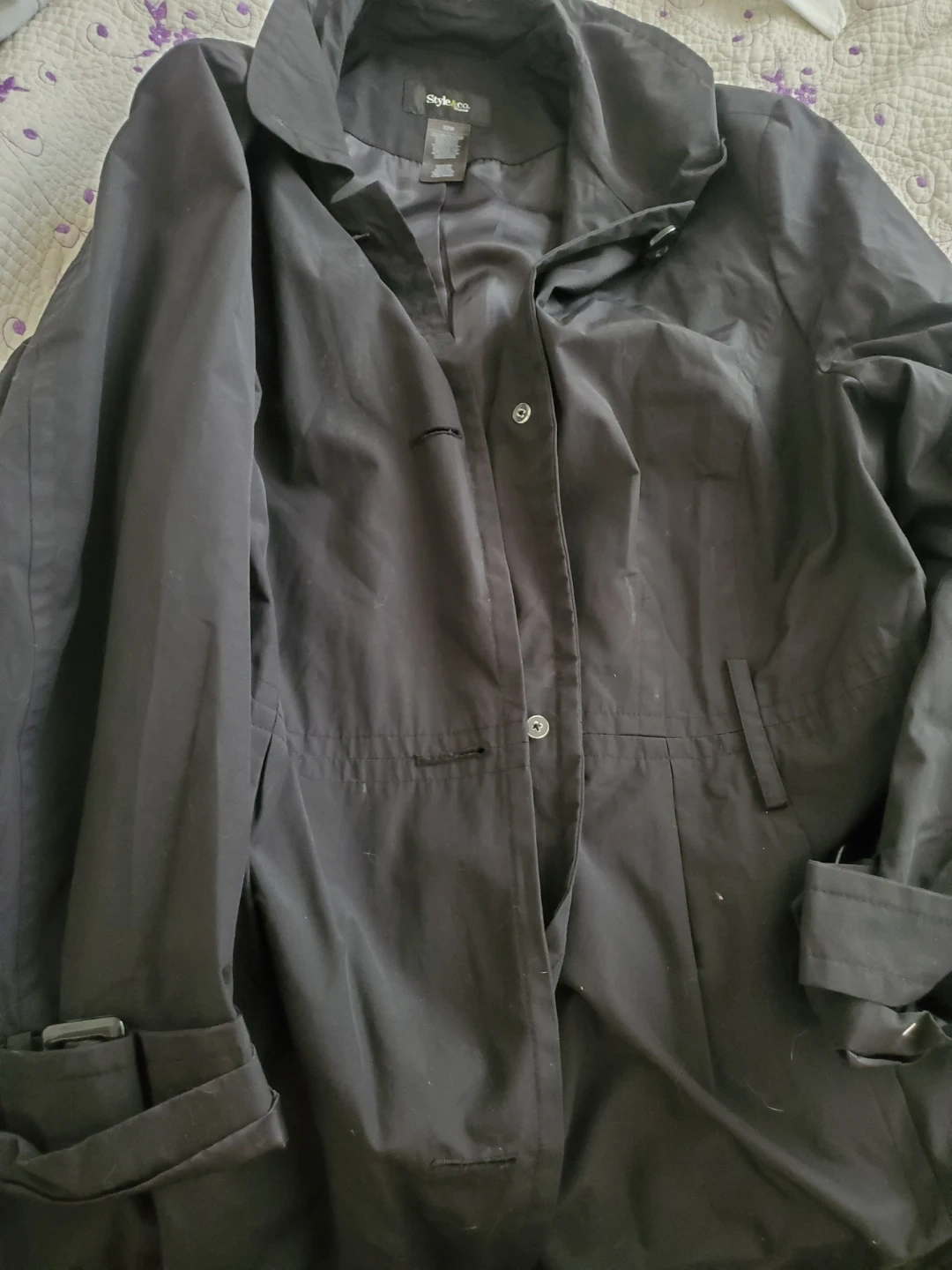 A black trench coat from Style & Co. Woman. It's a size 22W. The shell is a blend of 55% cotton and 45% nylon. The lining is 100% polyester. This coat is suitable for transitional weather.