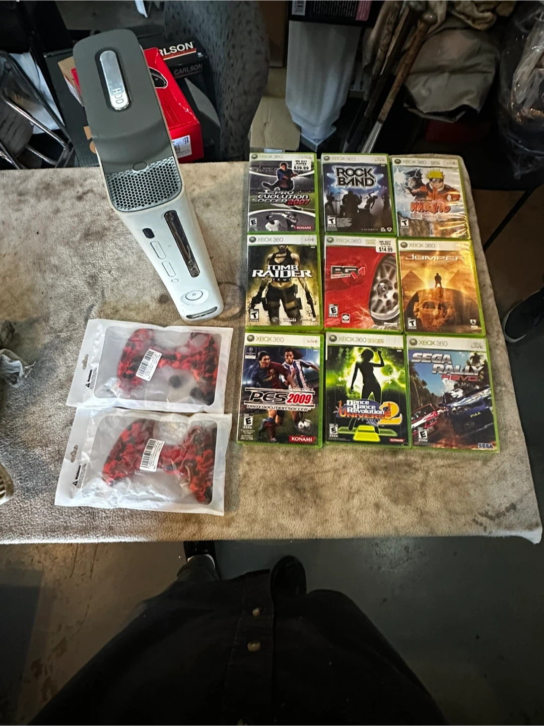 Selling a used Xbox 360 console with a selection of games. Great for some retro gaming fun! Includes games like Rock Band, Tomb Raider, and PES 2009
