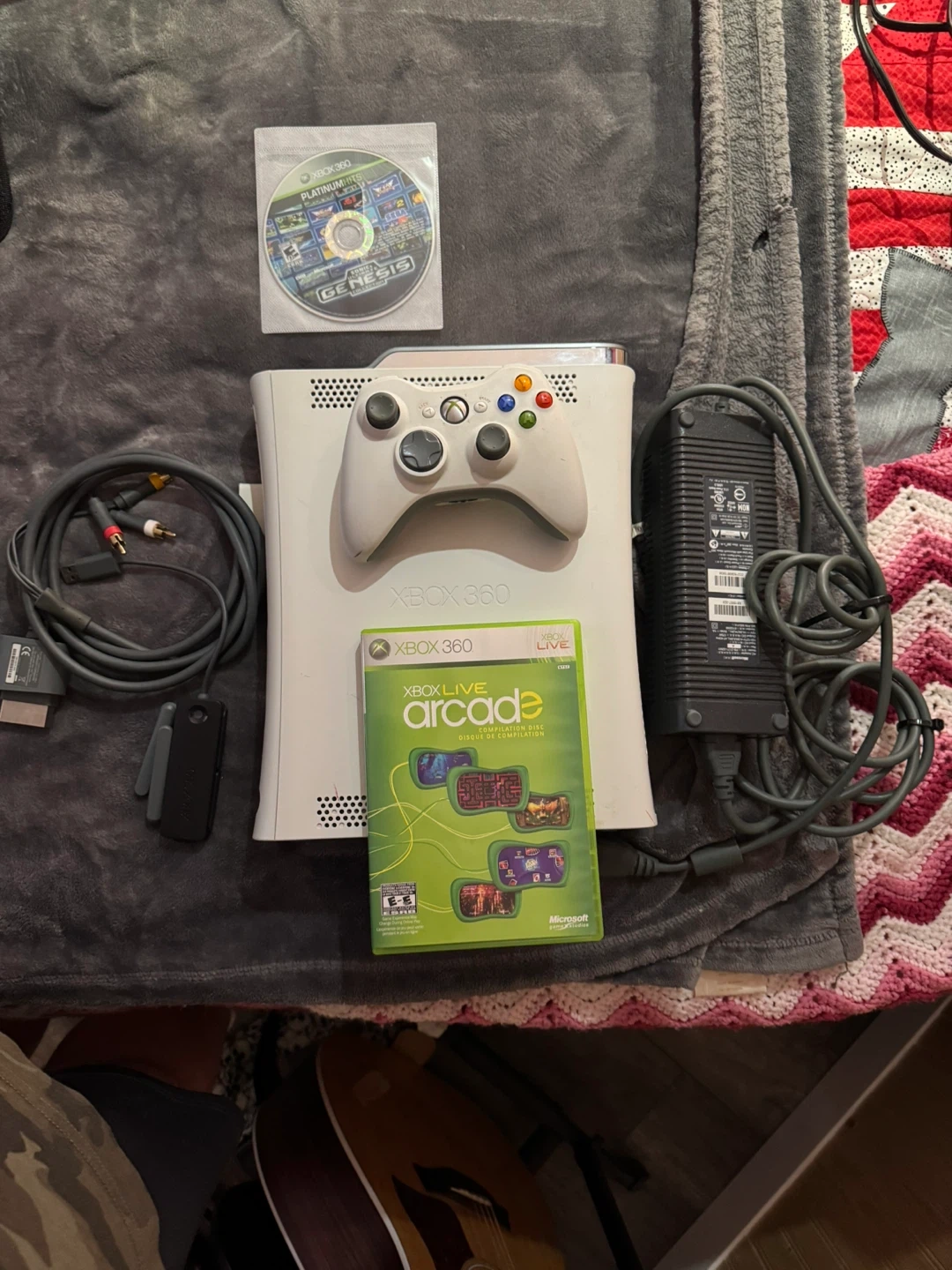 15Selling an Xbox 360 console, complete with a controller, power adapter, and AV cables! Also included are two games: - Xbox 360 Platinum Hits Genesis - Xbox Live Arcade Compilation Disc