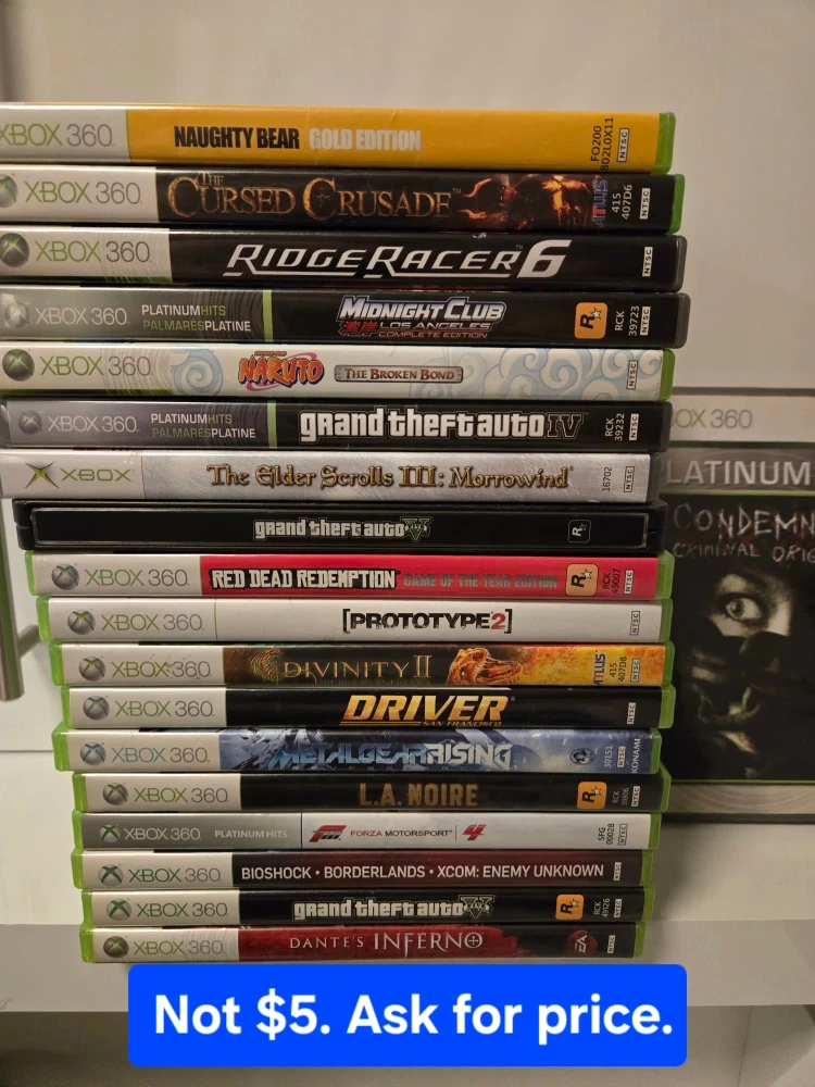708$5 each. Pickup 451 The West Mall Etobicoke. Shipping available. Games are all tested working. Most of the games are compatible on newer xbox consoles. Mint Xbox 360 official controllers $30 each. Open to trade a bunch for newer games or higher value items. Lots of other gaming stuff in my listings.