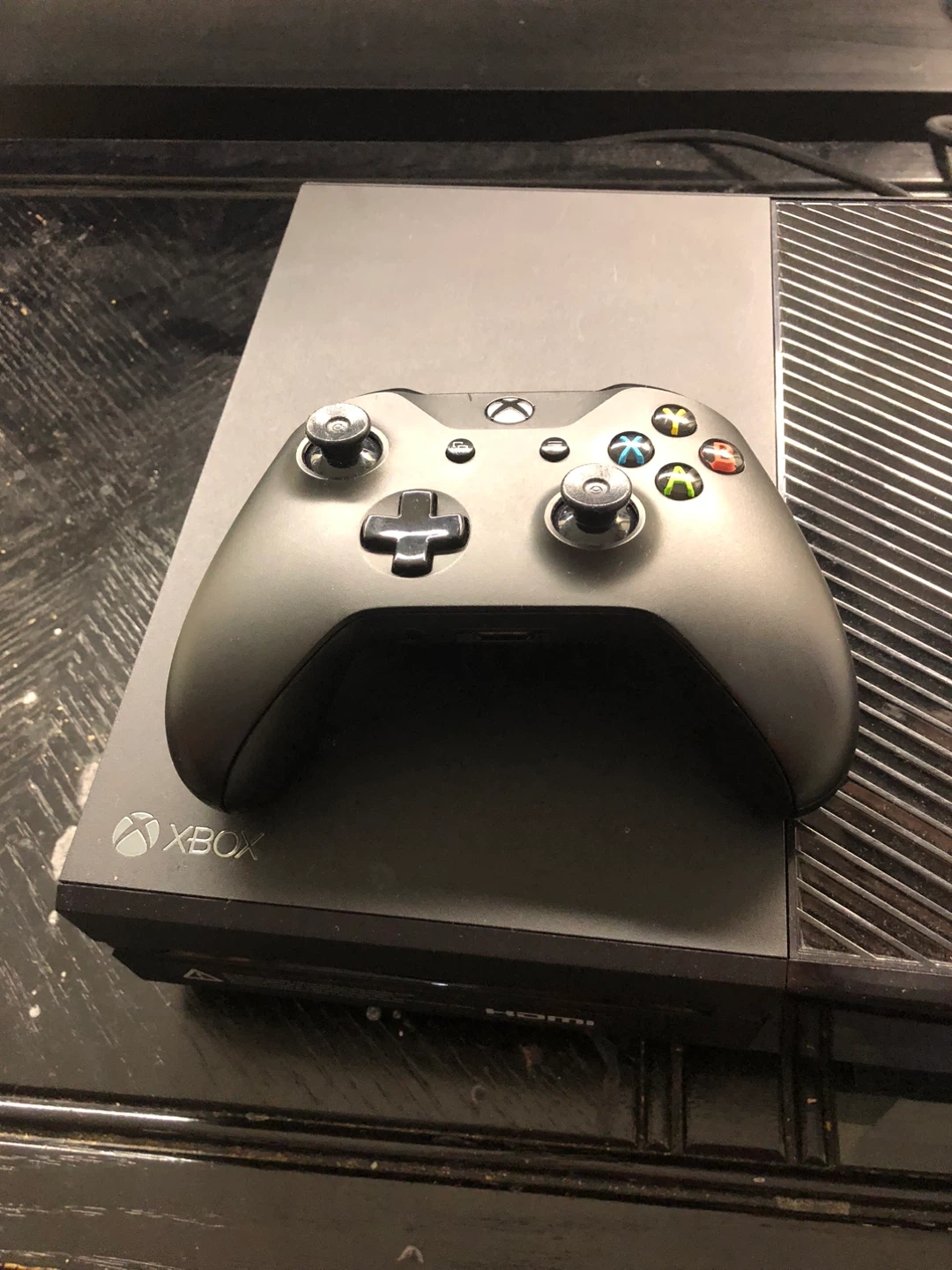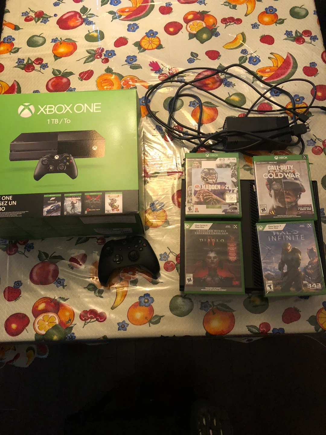 31Selling an Xbox One with 1TB of storage! It comes with a controller and several games. The original box is included as well, making it perfect for any gamer looking for a complete setup. Ready for a new home! 3 use game 1 brand new game