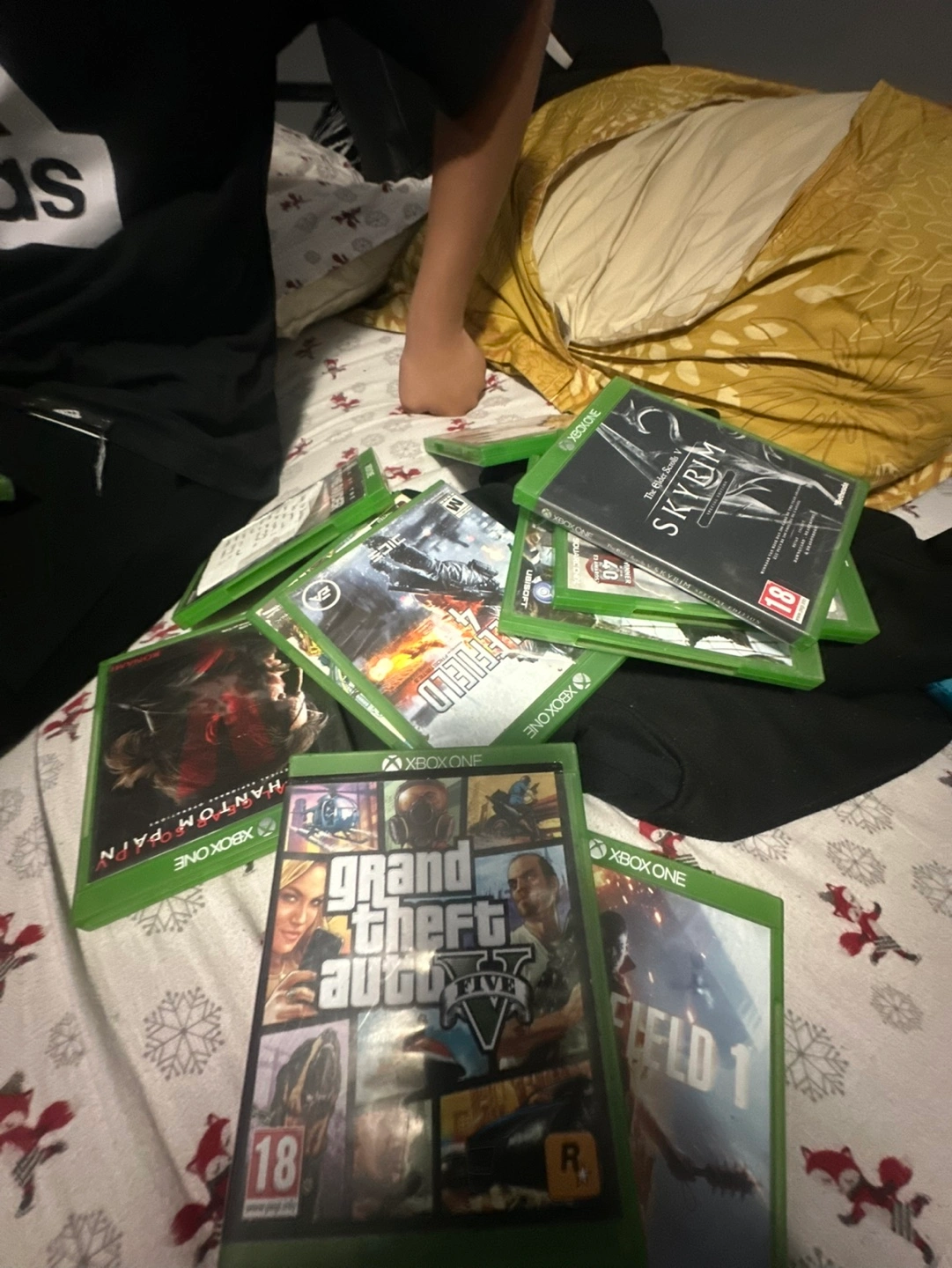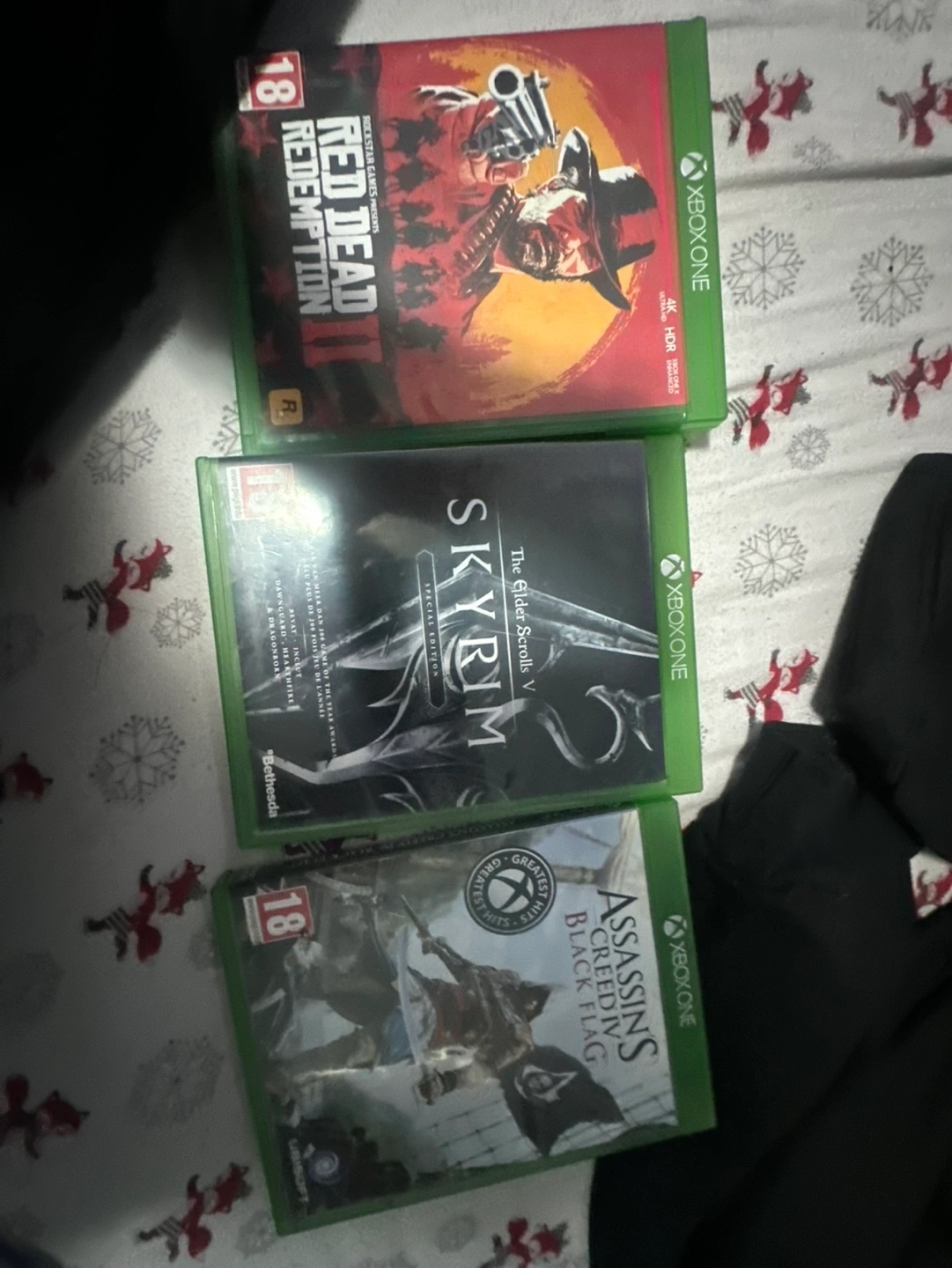 Bundle of 3 pre-owned Xbox One games. Titles include Red Dead Redemption 2, Skyrim, Assassin's Creed Black Flag, Grand Theft Auto V, and more. Great value for gamers. Sold as a bundle only.