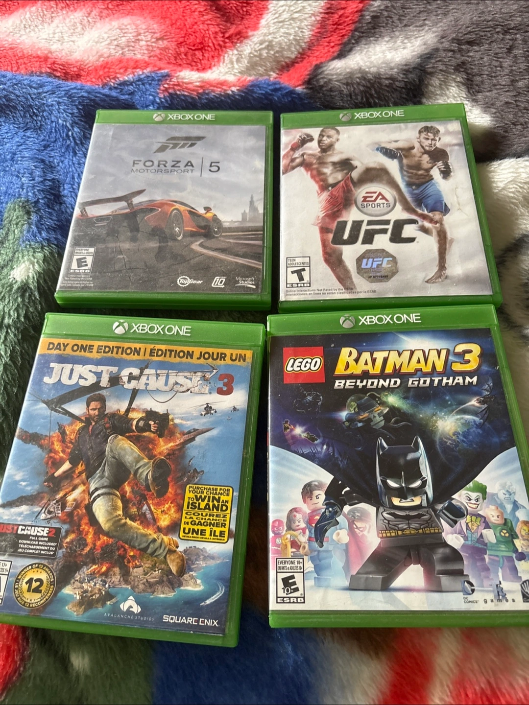 Selling a collection of Xbox One games! Includes: - Forza Motorsport 5 - EA Sports UFC - Just Cause 3 (Day One Edition) - Lego Batman 3: Beyond Gotham All games are in good condition and ready for a new player