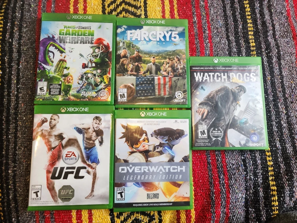 60Selling a collection of Xbox One games. Includes Plants vs Zombies Garden Warfare, Far Cry 5, Watch Dogs Signature Edition, UFC, and Overwatch Legendary Edition. $5 each or take all for $20
