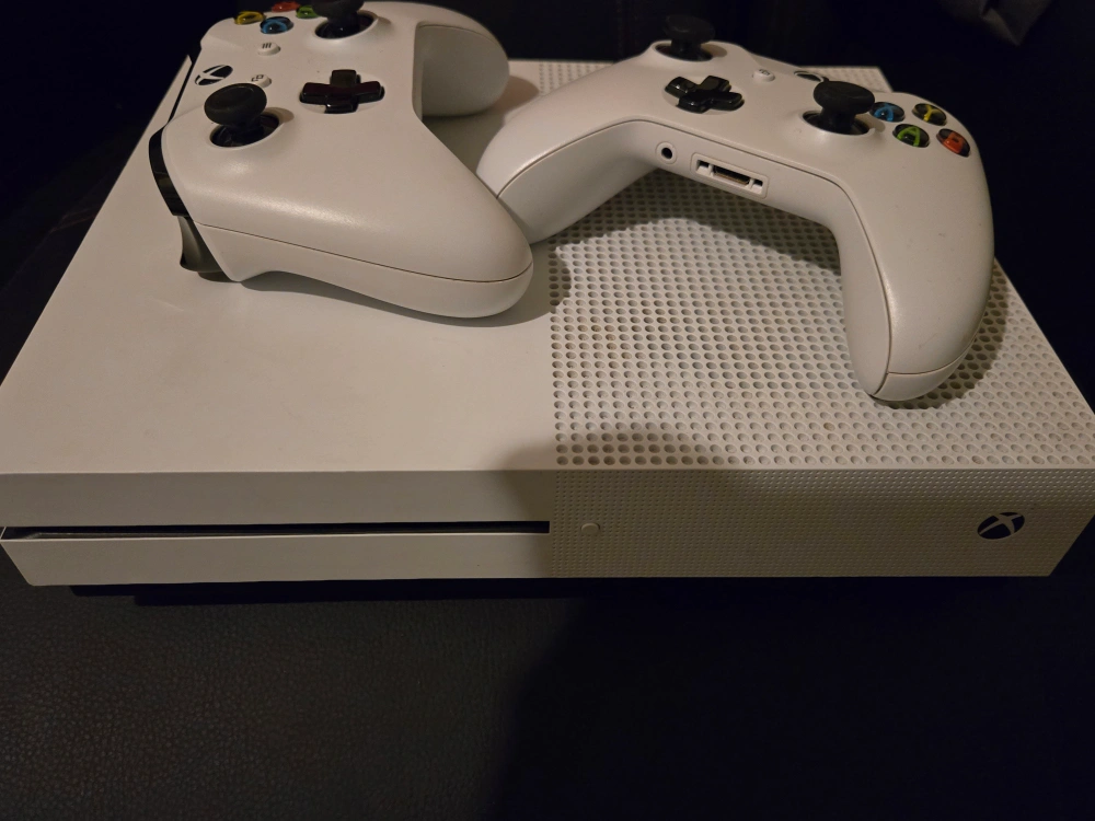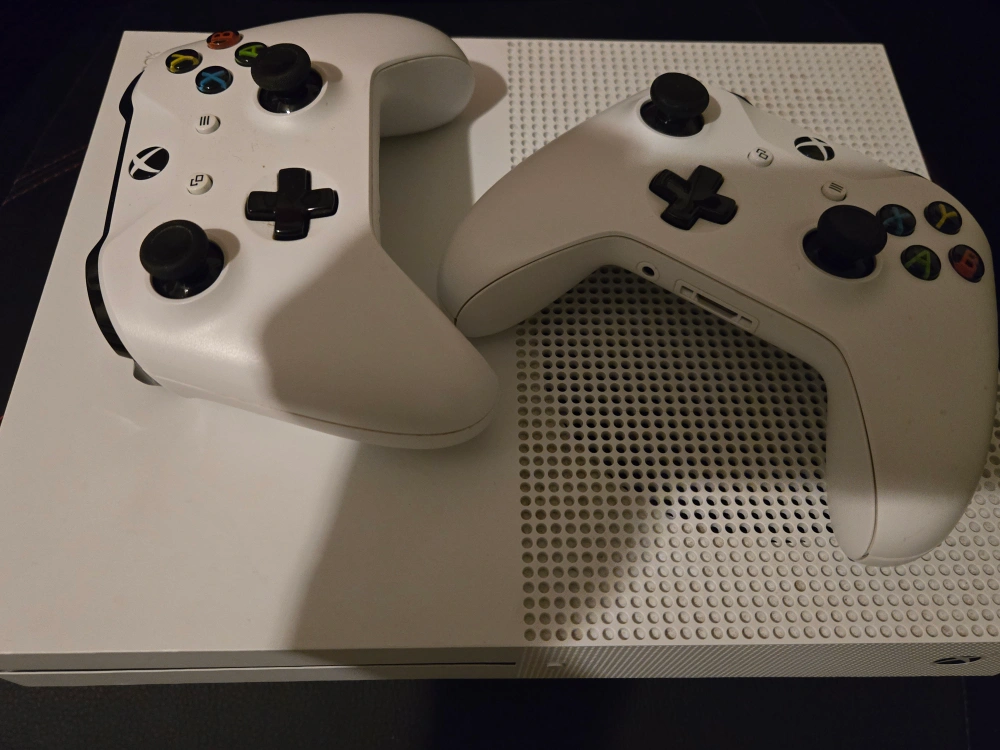 Xbox One S 1 TB disc edition console comes with two wireless controllers and a power cord. free delivery