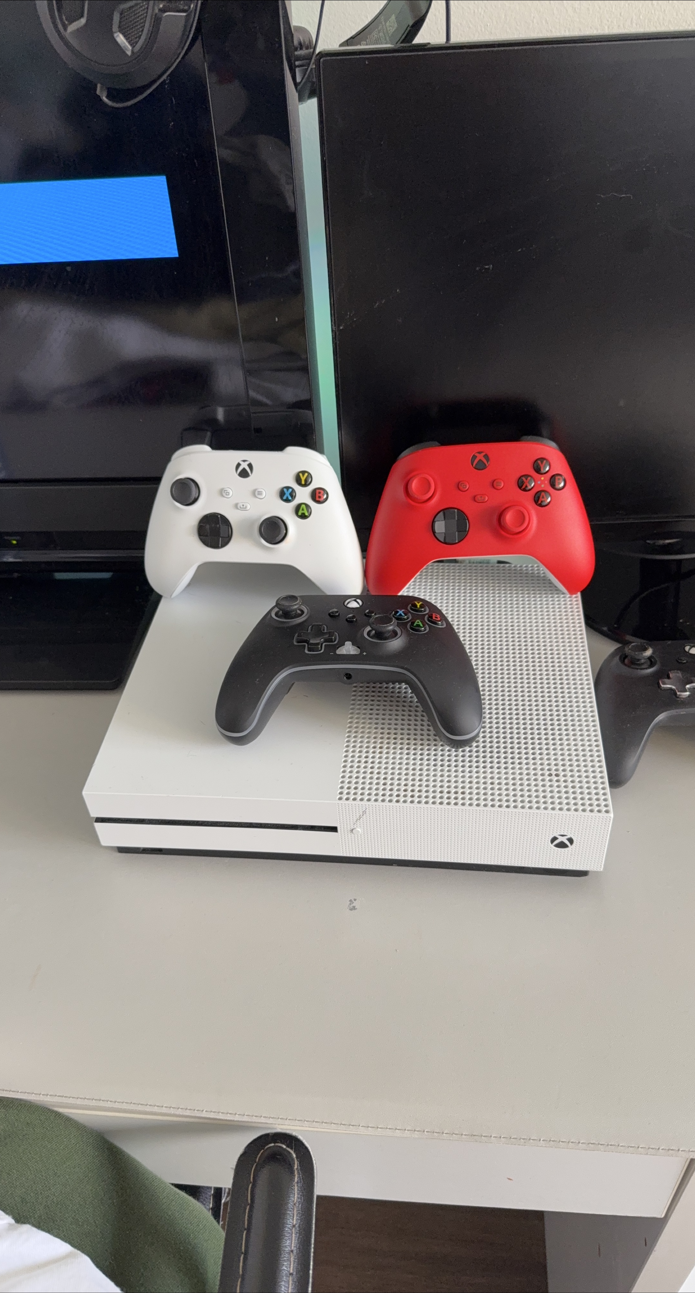 10Selling an Xbox One S console! It comes with a white console and three controllers: one white, one red, and one black. Great for some gaming fun!